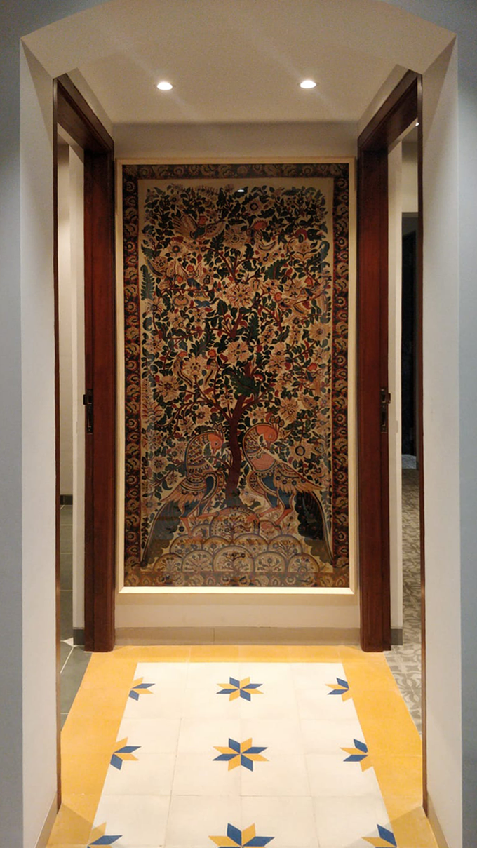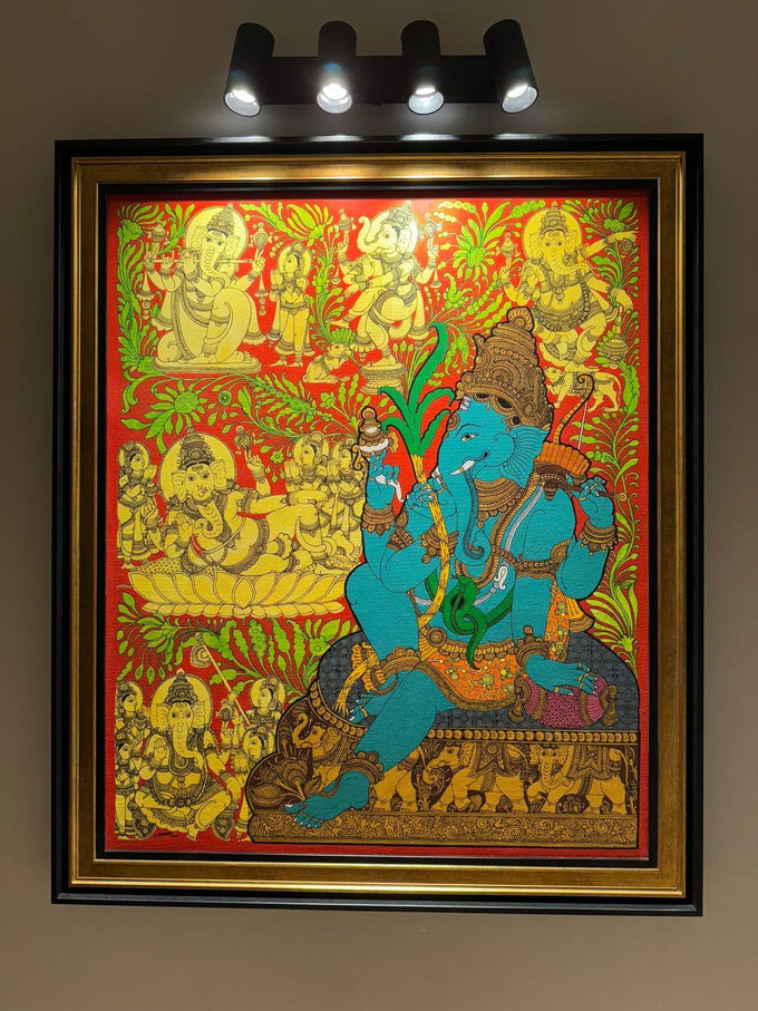 Exquisite fabric paintings with intricate floral and mythological designs.