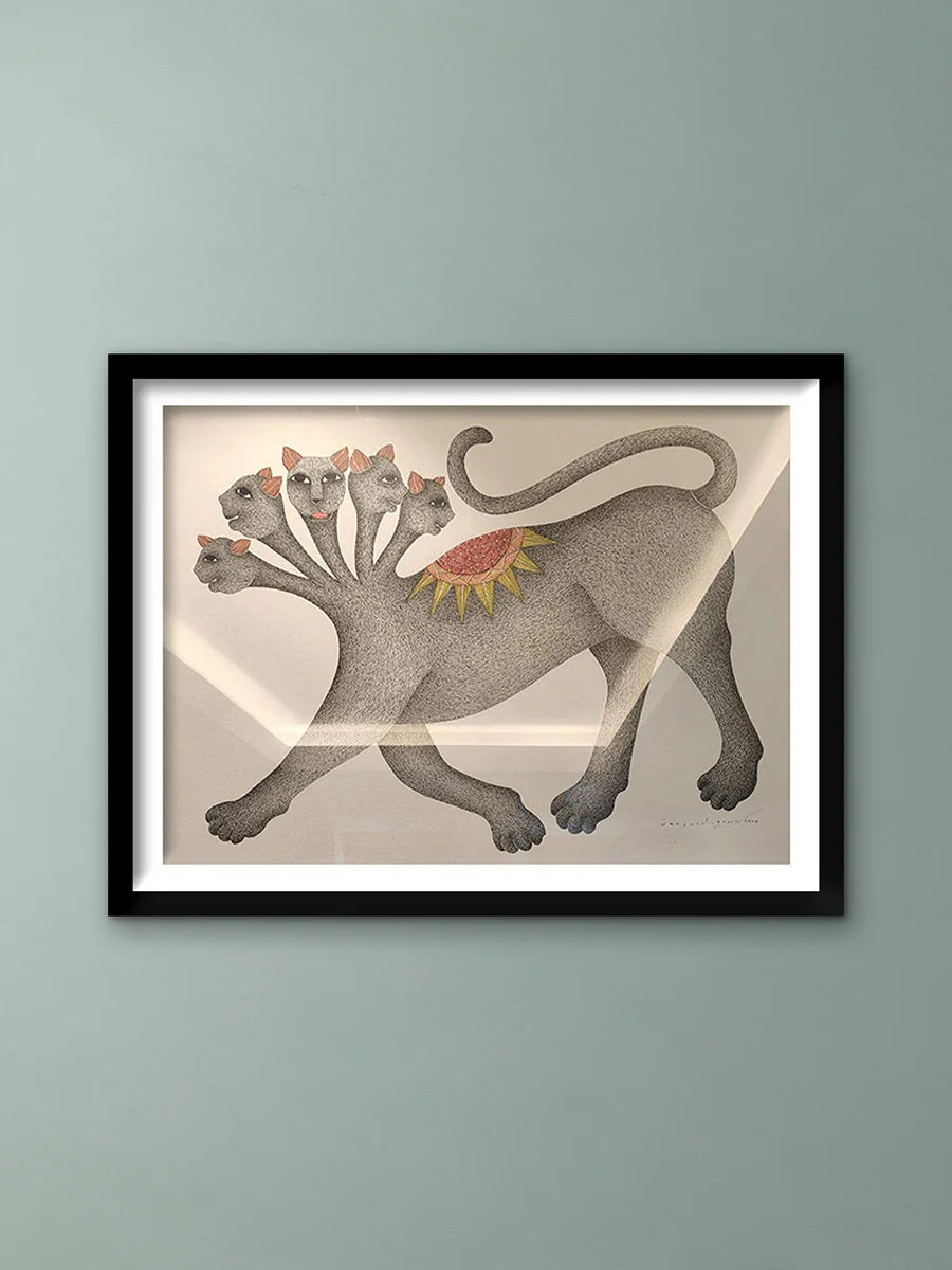 The Gonds have a deep and profound relationship with the tiger, not just as a creature of the forest, but as a revered deity. This reverence is reflected in their myths and the practice of worshipping a Tiger God.The most prominent name for the Gond tiger deity is Bagh Deo or Baghdev. Other names like Waghoba in Maharashtra and Bagheshwar are also used by the Gonds and other central Indian tribes. Bagh Deo is primarily seen as the protector of the forest and the villagers who live within or near it, and Shrines dedicated to him are commonly found outside Gond villages, typically marked by a simple stone or wooden idol, sometimes painted with the image of a tiger, often placed under a large tree. The worship of Bagh Deo reflects the Gond people's ancient understanding and practice of coexisting with tigers and leopards. They believe that by appeasing the Tiger God through offerings like sacrificial animals (like goats or chickens) and fermented alcoholic beverages made from Mahua flowers, they can prevent attacks on themselves and their livestock. In the below paintings, he is depicted as a divine being with the five senses and multiple heads.