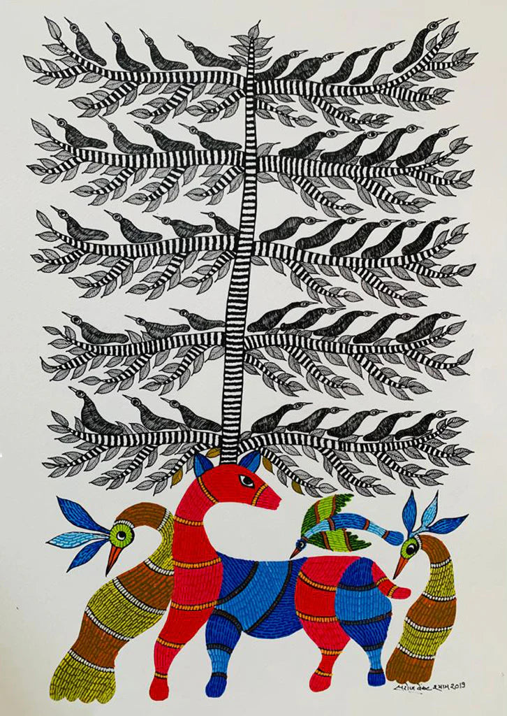 According to a Gond legend, thousands of years ago, the king of the tribal community would engage in warfare and often appeared riding on a flying horse which possessed magical powers and helped the king to succeed in his goal. This folk story is depicted in the below painting.