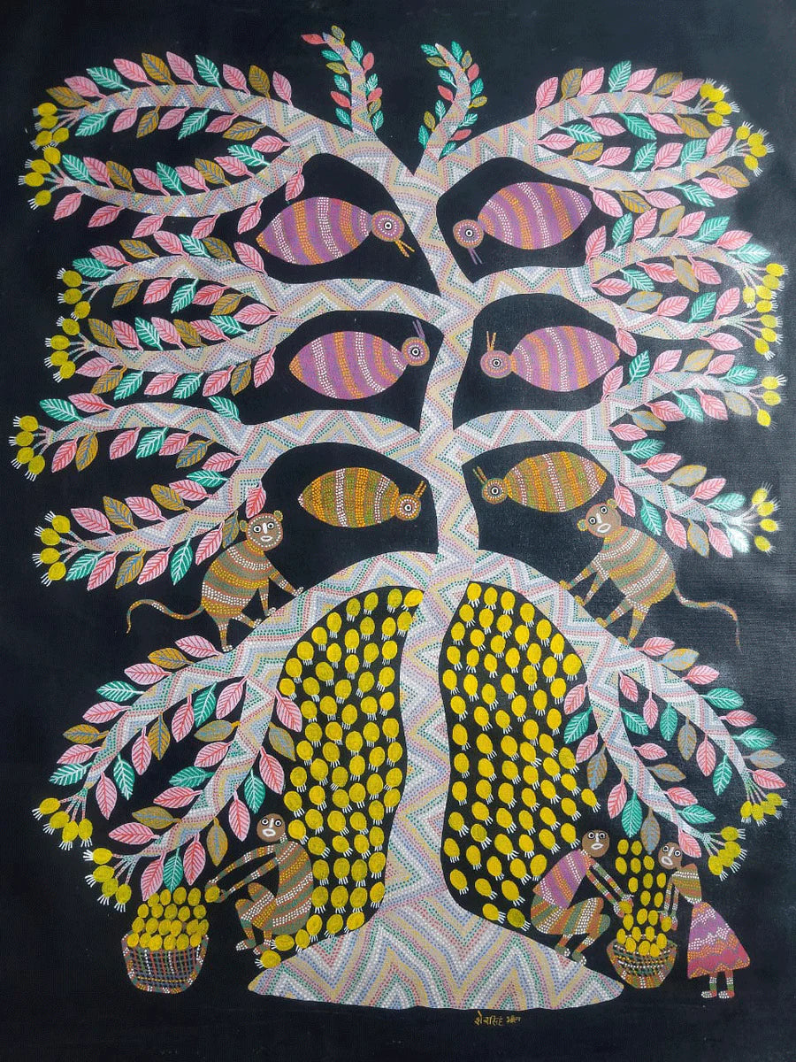 Bada Dev is the most significant deity in the Gond pantheon, revered as the Supreme God and Creator for many Gond communities. He is considered the ultimate authority, responsible for the creation of the world and all living beings. The Gond creation myth details his role in shaping the earth from primordial clay, with the help of a crow and a giant earthworm and later providing humanity with trees and the means for agriculture. His worship, often involving animal sacrifices and Mahua liquor offerings, typically takes place under sacred trees or at simple shrines, ensuring the community's well-being and a bountiful harvest. According to the belief of the Gond tribal people, Badadev hides in the saja tree and he descends from there to accept the Gond offerings. The painting is made in a belief that the trees rise towards the sky and connect themselves to the gods. Here we can see Badadev depicted in the form of a tree itself, with the branches of trees and peacocks merging with him.