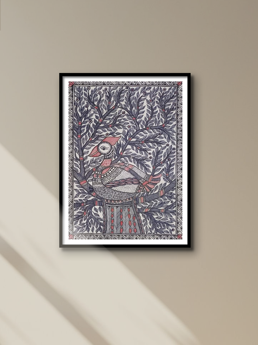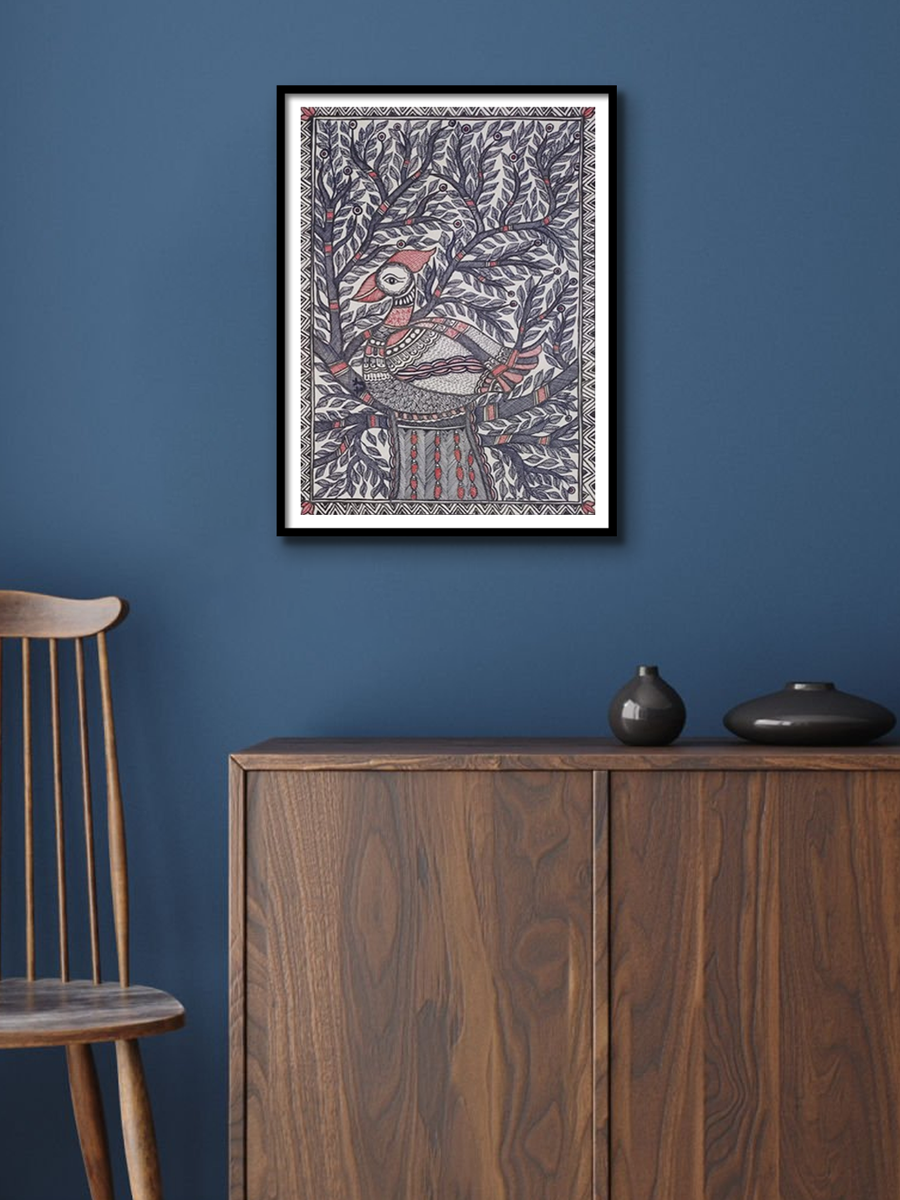 Ambika Devi's painting captures a mesmerizing scene of untamed wilderness. It portrays the sprawling presence of a magnificent tree, evoking a profound sense of tranquility in the viewer. With meticulous artistry, Ambika Devi beautifully showcases the deep-rooted customs and cultural heritage of ancient India through the poised bird perched gracefully on the tree branch. This avian figure exudes an aura of regality, embodying the essence of ancient traditions. The majestic tree serves as a nurturing haven for the enchanting creatures of nature, revealing the selflessness inherent in the natural world. Ambika Devi's intricate strokes and attention to detail highlight the interconnectedness of the ecosystem, as the tree sustains and shelters its inhabitants with unwavering generosity. This portrayal exemplifies the inherent balance and harmony that exists within nature, where each element plays a vital role in the cohesive tapestry of life.