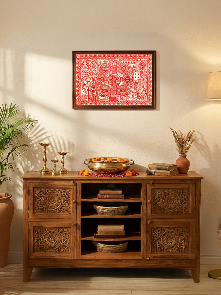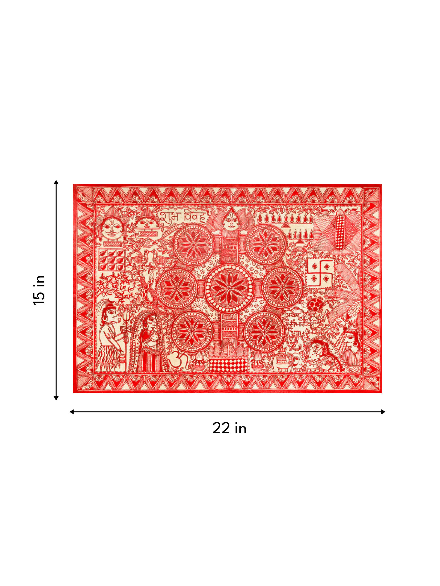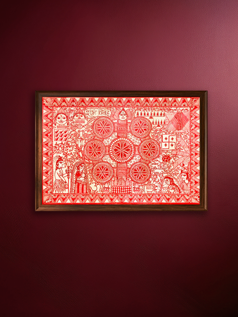 This intricate artwork by Ambika Devi portrays a Kohbar, that is a painting done primarily by women a day before a marriage takes in Mithila on the very spot where the marriage rituals are conducted. a Kohbar painting is considered auspicious as it depicts many elements like Shiva and Parvati, Fishes, the circle of life, etc, that brings abundance of wealth, prosperity and fortune to the bride and groom. The painting is also drawn during the Kohbar festival to celebrate and bless all the newly wed couples. Kohbar paintings are known for their bright naturally sourced hues and colours made from various plant materials. This particular monochromatic Kohbar painting drawn with bold red strokes signifies love, passion, auspisiuosness and joy. Monochromatic Kohbars also bring out the simplicity and intricate patterns of the different elements of the stories depicted in the painting. Often in a Kohbar many elements depic various stories and beliefs of the Mithila region. This painting itself represents multiple stories and beliefs where on one side we have Shiva and Parvati signifying their divine union as husband and wife while on the other side we see an elephant symbolizing good fortune, wisdom, and prosperity. Drawing the Kohbar in simple monochromes focuses on the stories that the artist wants to tell the viewers instead of the viewers getting carries away by the vibrant colours. Monochromatic Kohbar paintings also depict balance, harmony and unity that spreads evenly throughout the painting and shows a holistic picture.