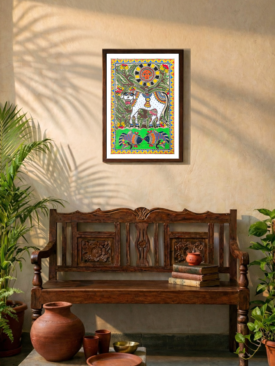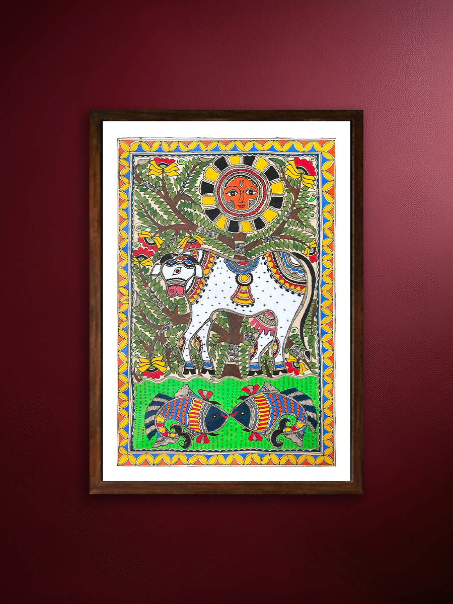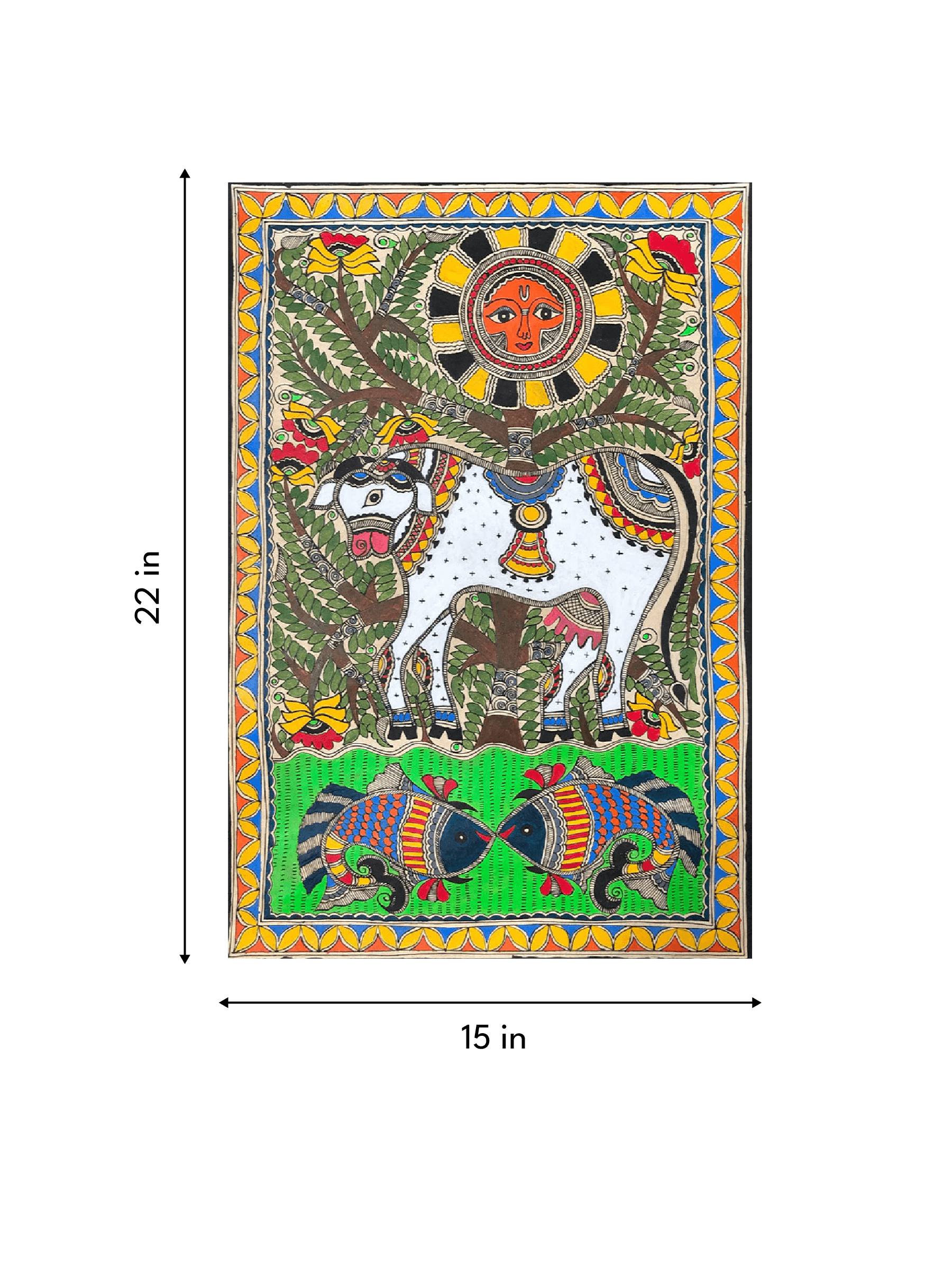 Ambika Devi created a captivating Madhubani painting that beautifully portrays the harmony of nature. The artwork depicts a cow grazing, fish swimming in the water, and the sun shining above. Each element holds symbolic significance, representing the interconnectedness and vitality of the natural world. Through her art, the artist showcases the complete essence of nature in a captivating and meaningful way.