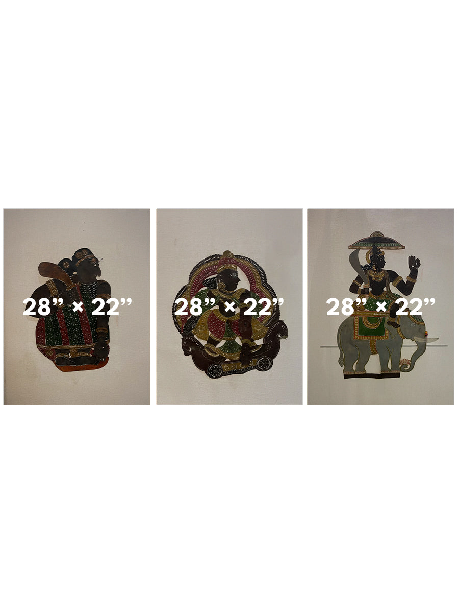 This magnificent leather puppet crafted by Rajeev Pulavar depicts the regal figure of Devendra, the king of gods and ruler of the heavens in Hindu mythology, majestically seated upon his divine elephant, Airavata. The deity is portrayed with commanding grace, holding a weapon in one hand while the other is raised in a blessing gesture, offering protection to his devotees. Devendra’s tall, upright posture exudes authority, his muscular figure adorned with golden ornaments that shimmer with intricate dot patterns in white and yellow. His elaborate crown and the canopy over his head underscore his royal status, the parasol symbolizing divine sovereignty.