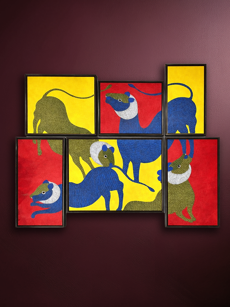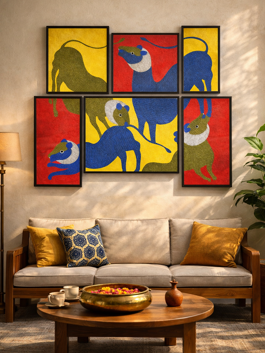 This Gond painting by Gareeba Singh Tekam presents a dynamic constellation of lions distributed across interlocking panels of red, yellow and earthy brown, creating a rhythmic visual field. Originating in the tribal Gond community, which lives in close communion with nature, these paintings portray a strong belief that every aspect of nature is animate and sacred. Each lion is rendered in the characteristic Gond idiom where bodies are filled with dense linear and dotted patterning that suggests fur, vitality and inner energy, while elongated limbs and arched tails convey alertness and motion.
