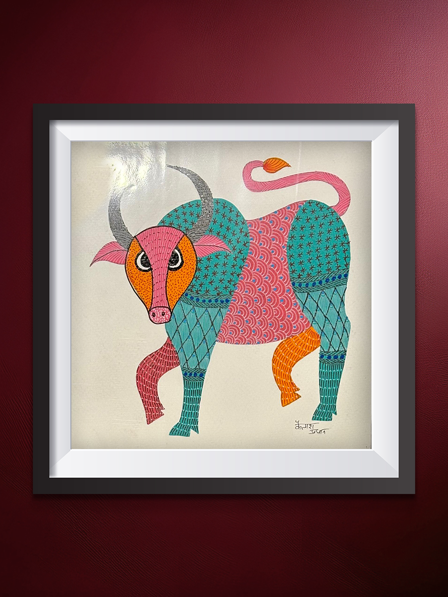 Through its vibrant palette, balanced posture, and meticulous detailing, the painting transforms the bull into a symbol of vitality, resilience, and sacred presence within the natural world, expressed through the rhythmic storytelling of Gond art.