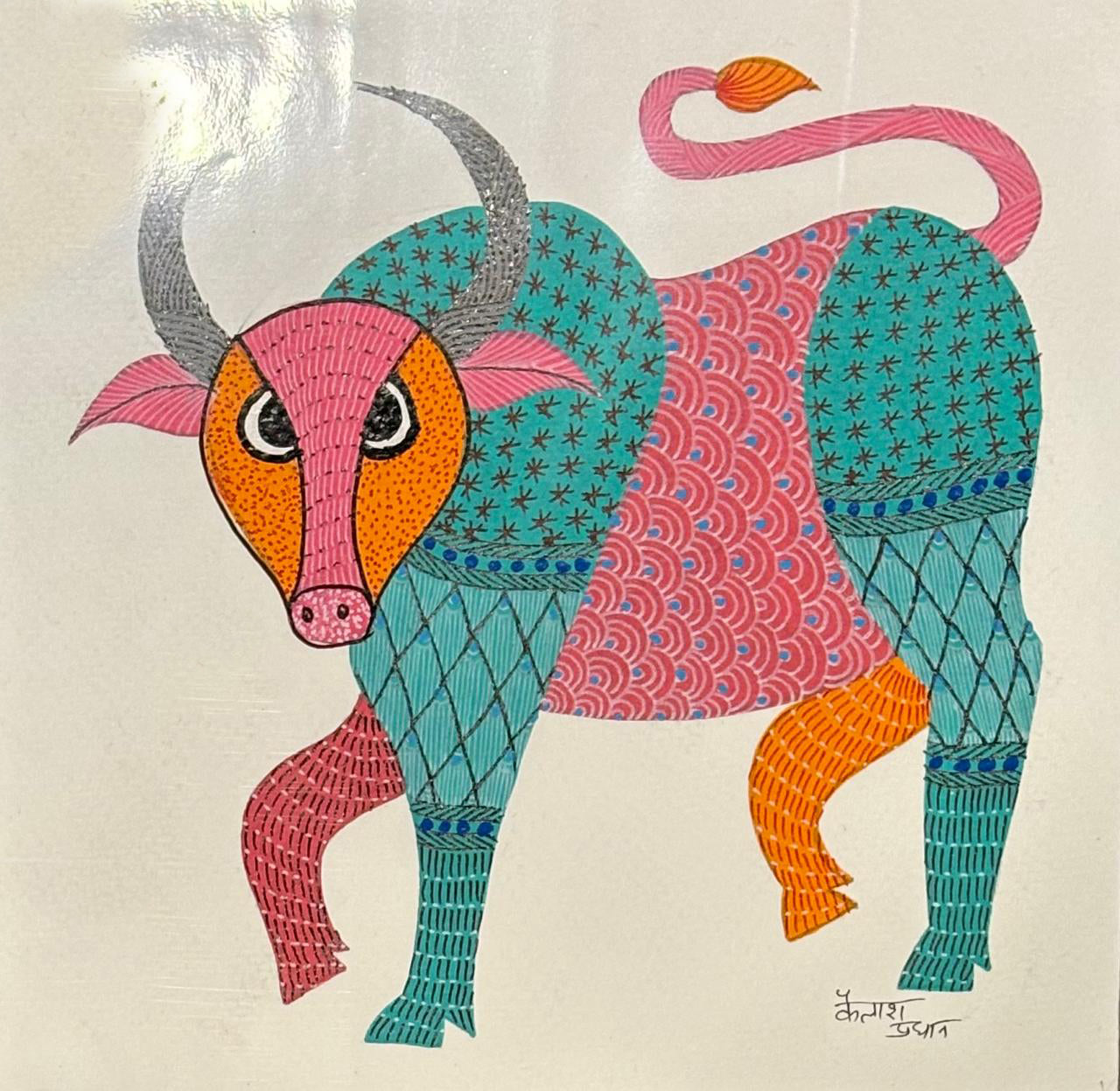 This Gond painting by Kailash Pradhan presents a stylized bull standing firmly, its form structured through bold color divisions and intricate patterning.