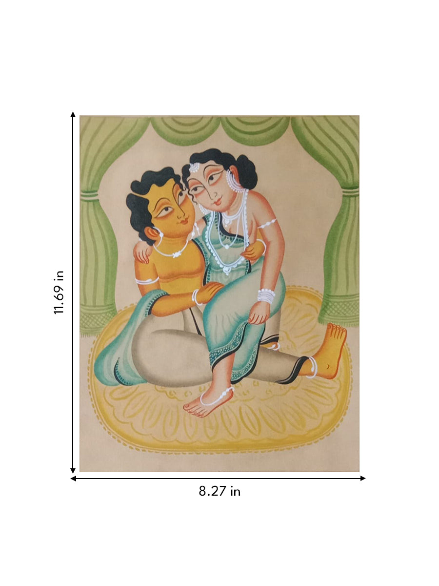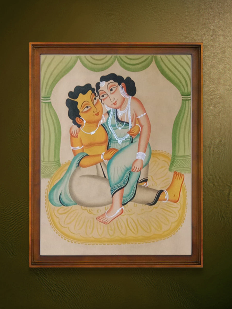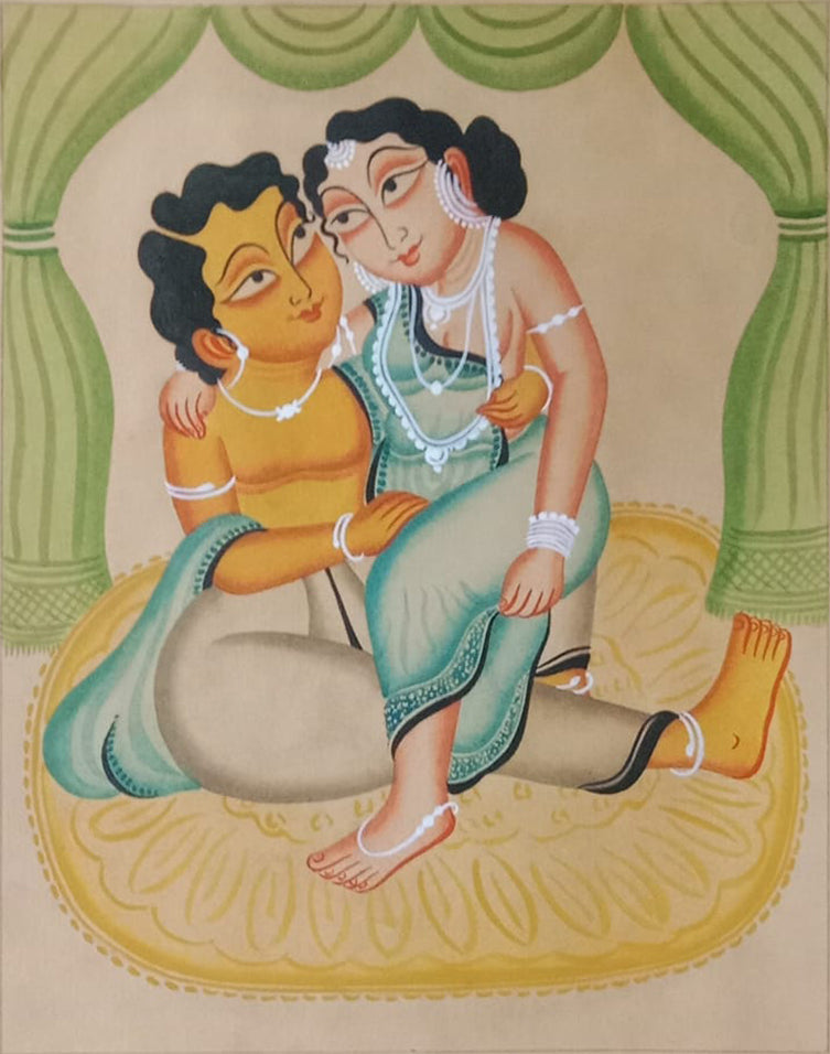 Kalighat paintings emerged in nineteenth-century Bengal as a popular urban art form, often portraying scenes of domestic life, romance, and social behavior with immediacy and subtle humor. This work reflects that legacy, transforming a quiet, private moment into a vivid narrative image marked by intimacy, warmth, and the distinctive graphic elegance of the Kalighat style.
