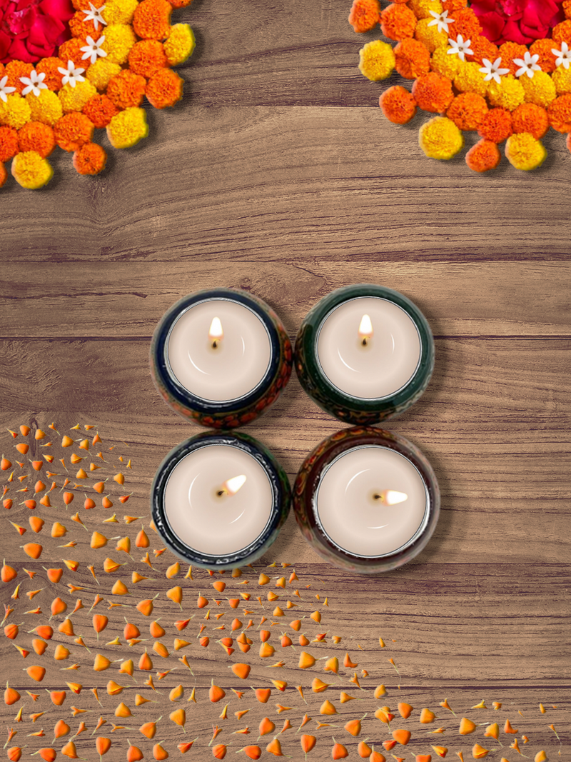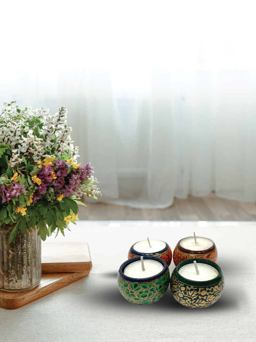 This set of four paper mache tea lights from Kashmir is beautiful set to add to your Diwali decor collection. When assembled together, it will create a symphony of gleaming lights that would shine from afar and look like elaborate art pieces as you come closer to them.