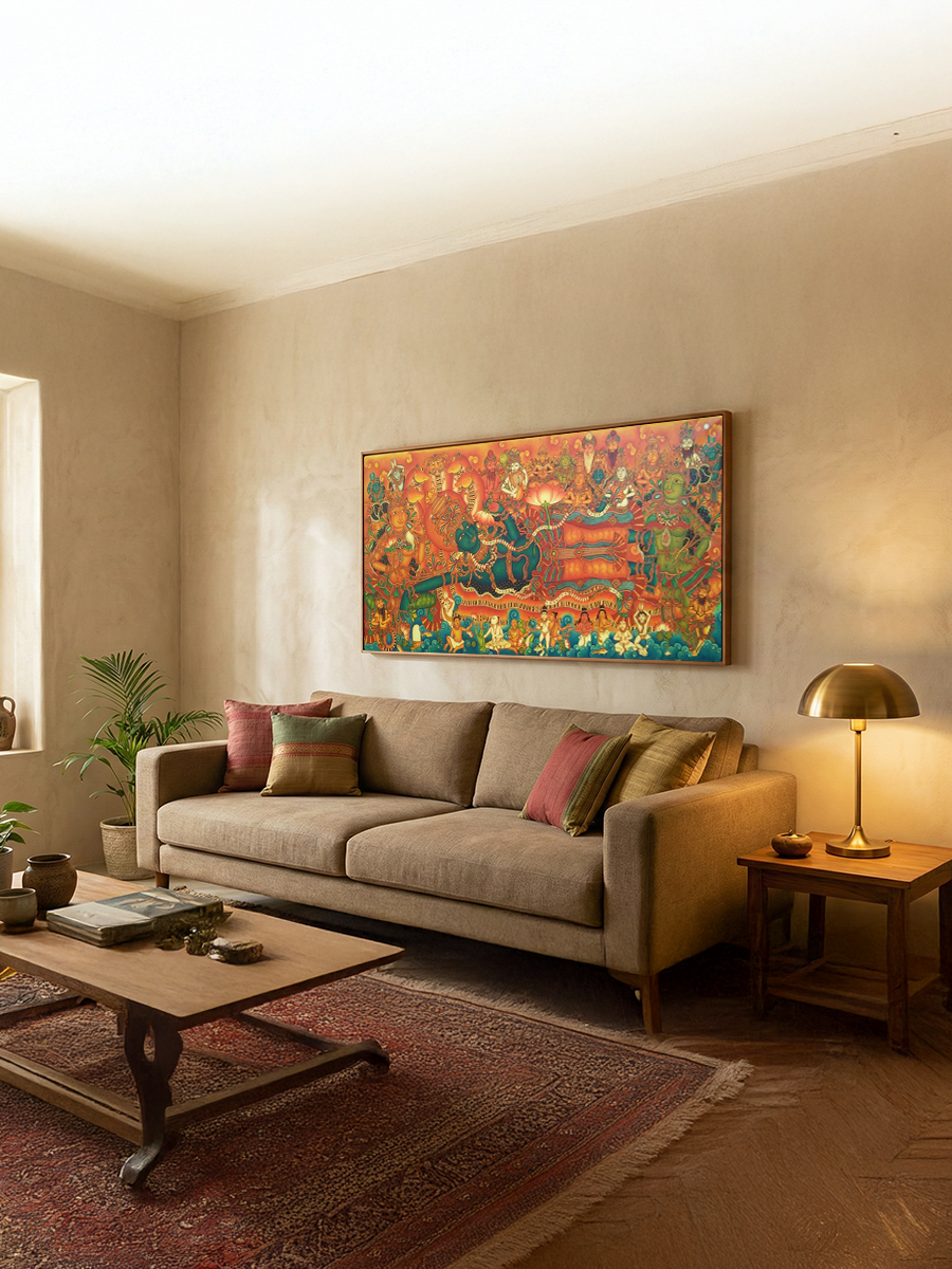 Renowned artist V.M Jijulal's Kerala Mural Painting, "Ananthasayanam," captivates with its divine portrayal of Lord Vishnu in His sleeping form, resting upon the coils of the mighty serpent, Shesha. This artwork encapsulates a profound moment in Hindu mythology when Narayana awakens, and from His belly, a lotus blooms, giving birth to Brahma, the embodiment of intellect and the force that distinguishes the self from all that is not. Jijulal's meticulous craftsmanship within the Kerala Mural tradition brings this narrative to life with a symphony of vivid colors, telling a tale of cosmic significance. The rich palette of ochre, turquoise, and earthy greens dance harmoniously, mirroring the eternal cycle of creation, preservation, and dissolution. Intricate patterns and motifs, characteristic of this art form, adorn the canvas, symbolizing the intricate interplay of cosmic forces. In "Ananthasayanam," Jijulal seamlessly merges artistry and spirituality. This painting isn't just a visual feast; it is a gateway to the metaphysical. It transports the observer to a realm where seeker, seeking, and sought are one—the ultimate realization of Brahman. In its purest form, it signifies that beyond dissolution, there exists only pure consciousness, embodied by Narayana. This piece speaks to the heart of Kerala's artistic tradition, a profound testament to the enduring power of storytelling through art.