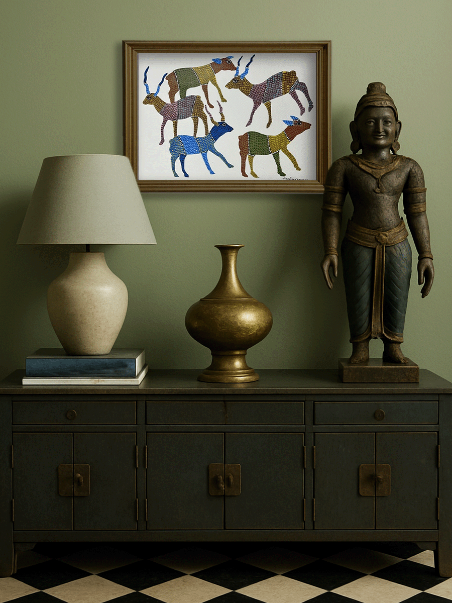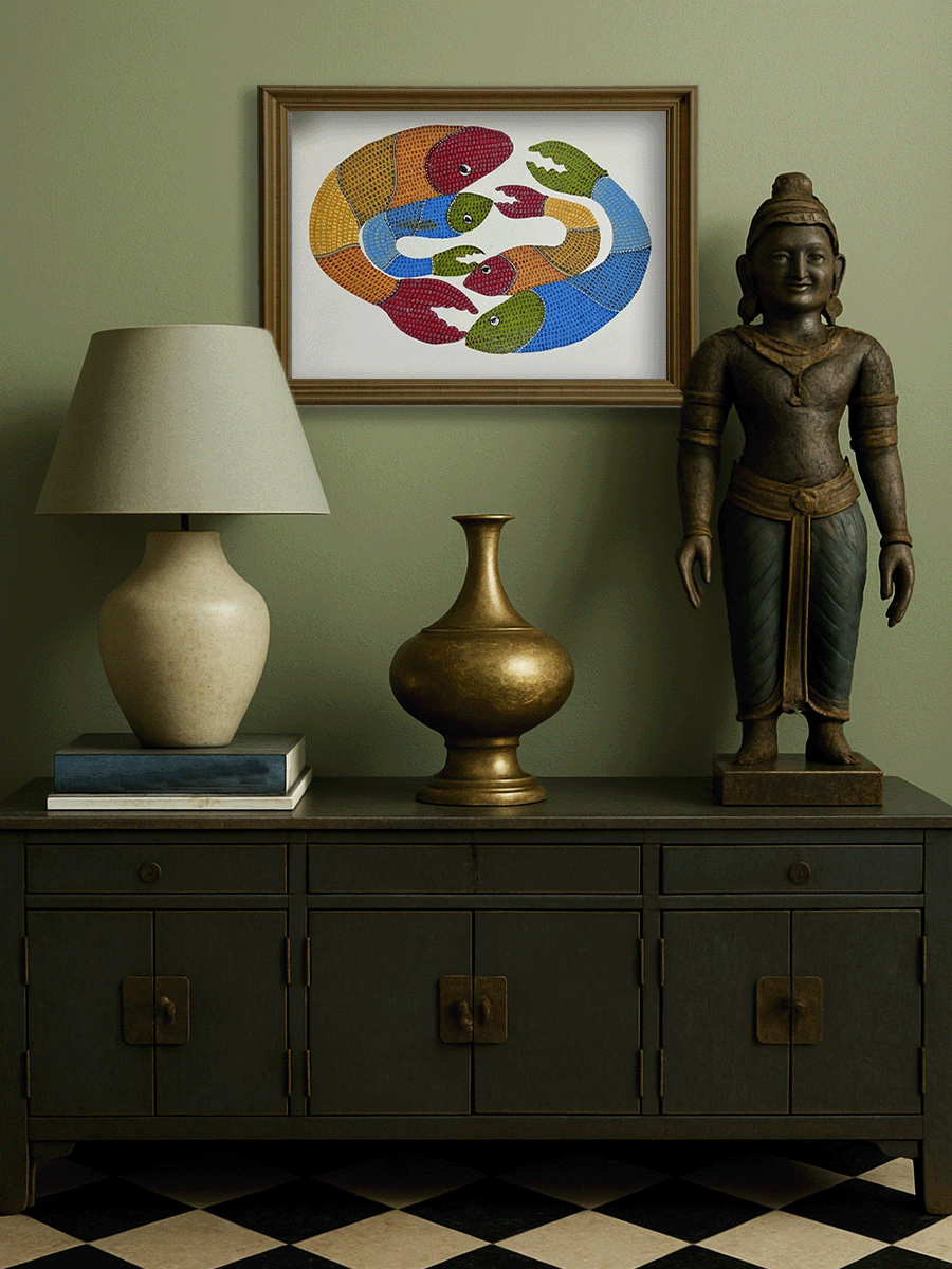 Bio | Gareeba Singh Tekam, a distinguished Gond Artist hailing from Dindhori, Patangarh, Madhya Pradesh, has dedicated 25-30 years to mastering the intricate art form of Gond painting. Influenced by his family legacy, Gareeba learned the art from the renowned pioneer of Gond painting, Jangarh Singh Shyam. Alongside his wife and daughter, he passionately continues this artistic tradition, primarily receiving national recognition while occasionally garnering international acclaim. Despite limited formal education up to the 6th grade, Gareeba's artistic prowess shines through his vibrant creations, which often depict the enchanting beauty of nature. His largest masterpiece, a stunning 10 feet by 8 feet painting showcased at the Taj Hotel during the Dastakar Haat Committee event, highlights his deep connection to the environment. While Gareeba predominantly paints on canvas and paper, his versatility extends to various materials, ensuring his captivating narratives find expression on walls and fabrics alike. Fueled by a desire to preserve cultural heritage and share stories from the annals of history through his art, Gareeba remains steadfast in his commitment to both tradition and innovation, inspiring future generations to cherish their roots amidst the rapid pace of modernization. |