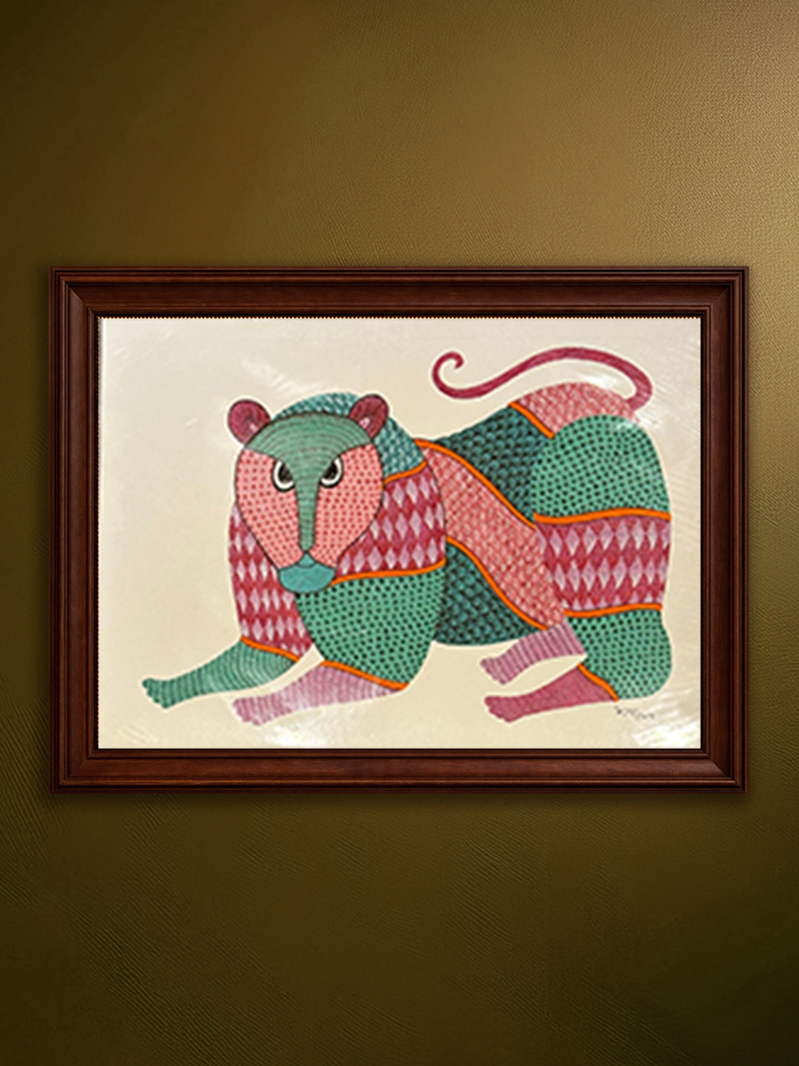 Through its poised stance and richly segmented surface, the tiger becomes more than a forest predator—it emerges as a guardian presence and a living embodiment of strength within the Gond cosmology, where animals are revered as conscious beings sharing the same sacred landscape as humans.