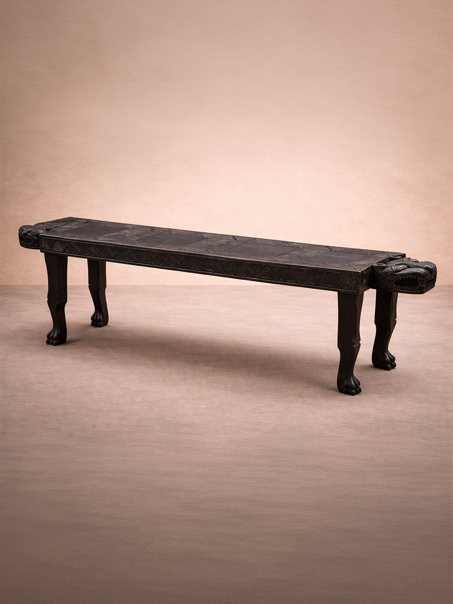This rustic three-seater bench is carved from a single length of dark, weathered wood, its elongated plank seat supported by four hand-hewn legs that taper slightly toward the ground. The ends retain the natural contours of the timber, lending the piece a sculptural, organic character, while the minimal, unadorned form reflects vernacular rural craftsmanship designed for durability and everyday communal use.