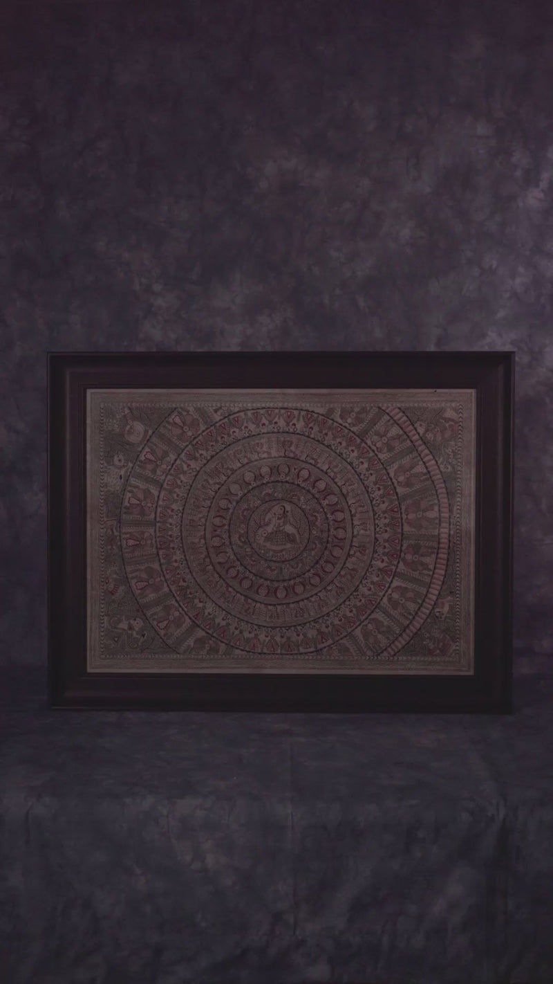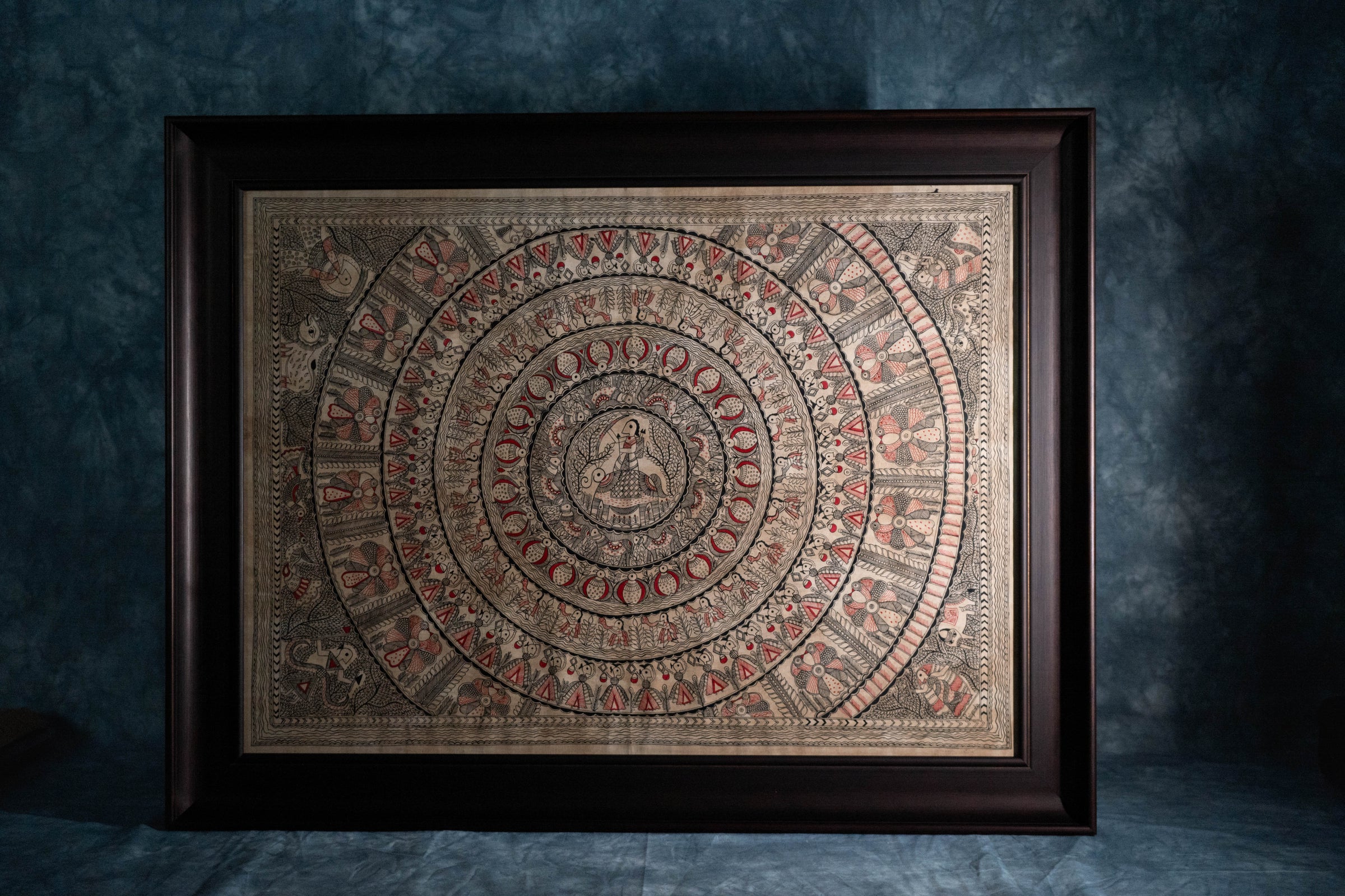 This artwork has been painted by a Kumari Priyanka, who has been practising the Godna tradition since her childhood. Godna painting, inspired by the tribal tattooing tradition, is a vibrant folk art practiced by communities in Northern and Central India. Historically, Godna involved inserting ink into the skin to create intricate designs symbolising nature, mythology, and daily life. Over time, this art transitioned to paper and canvas, using handmade paper, fabric colours, and brush nibs. Godna paintings often feature motifs from epics like the Ramayana and Mahabharata, as well as tribal legends. Made in a period of four days, this particular artwork pays homage to Birsa Munda, a respected tribal leader and freedom fighter from the Munda community, revered as a god in Jharkhand.