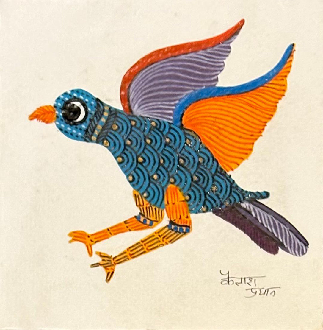 Through its playful stylization, careful patterning, and dynamic posture, the painting captures not just a bird, but a lively expression of motion and imagination rooted in the visual storytelling language of Gond art.