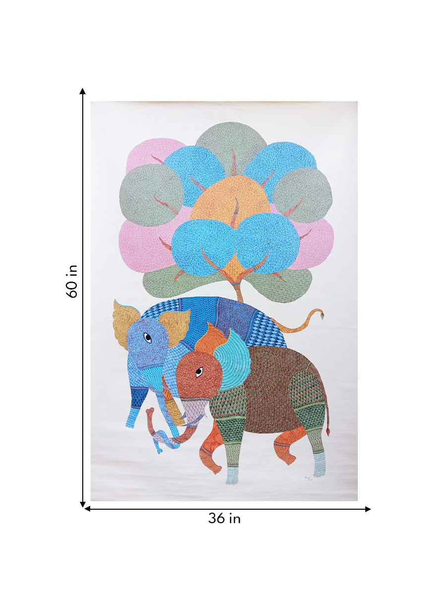 This serene Gond painting by Kailash Pradhan features a pair of elephants walking beneath a stylized tree, illustrating the harmony and grandeur of the natural world. Originating in the tribal Gond community, which lives in close communion with nature, these paintings portray a strong belief that every aspect of nature is animate and sacred.Set against a neutral, off-white background, the work utilizes a rich palette of primary and secondary colors to define its intricate forms. The composition is divided into two distinct levels, showcasing the relationship between the earth and the canopy.