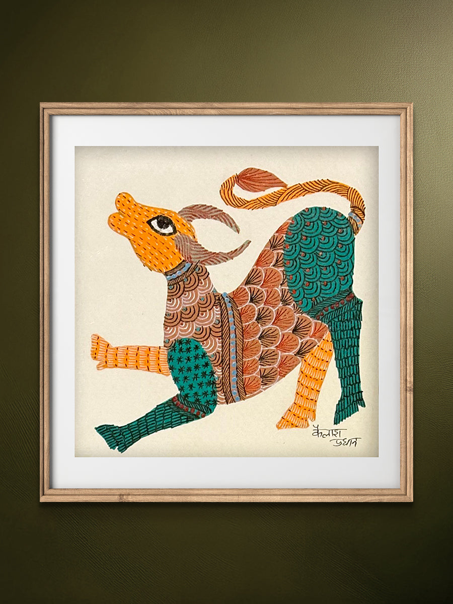 Through its balanced composition, vibrant palette, and meticulous ornamentation, the painting celebrates the graceful vitality of the deer and its quiet connection to the natural world, expressed through the rhythmic storytelling of Gond art.