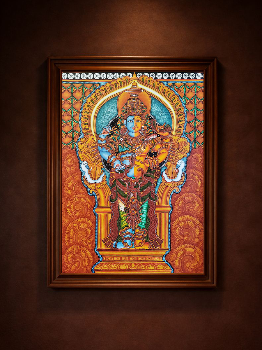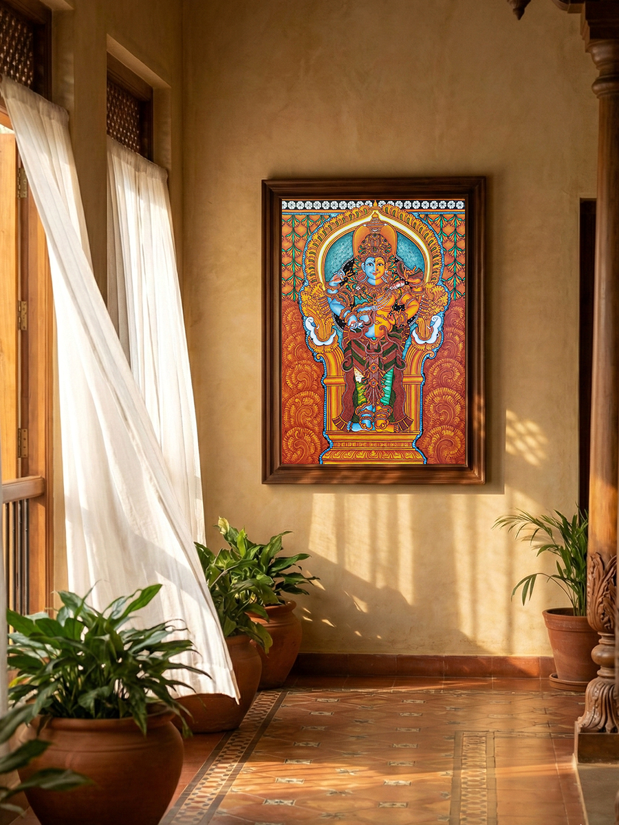 The Kerala mural painting displayed is a striking representation of Ardhanarishwar, a composite form of the Hindu gods Shiva and Parvati, embodying both masculine and feminine energies. Crafted by the artist Adarsh, this artwork vividly portrays the deep-rooted cultural and spiritual heritage of Kerala. The right half of the figure, representing Shiva, is adorned in vibrant shades of blues and whites, symbolizing masculinity and tranquility. In contrast, the left half, depicting Parvati, features warmer tones of orange and gold, illustrating femininity and creativity. Both halves are richly embellished with traditional jewelry and attire, showcasing intricate detailing that is characteristic of Kerala mural art. The background features elaborate architectural elements and a peacock feather motif, enhancing the divine theme. This art form, which dates back to the 8th century, typically utilizes natural pigments and depicts themes from Hindu mythology, reflecting both aesthetic beauty and spiritual depth. The painting not only captures the essence of divine unity in duality but also demonstrates the artist's mastery in blending vivid colors and detailed expressions, making it a captivating piece of cultural artwork.