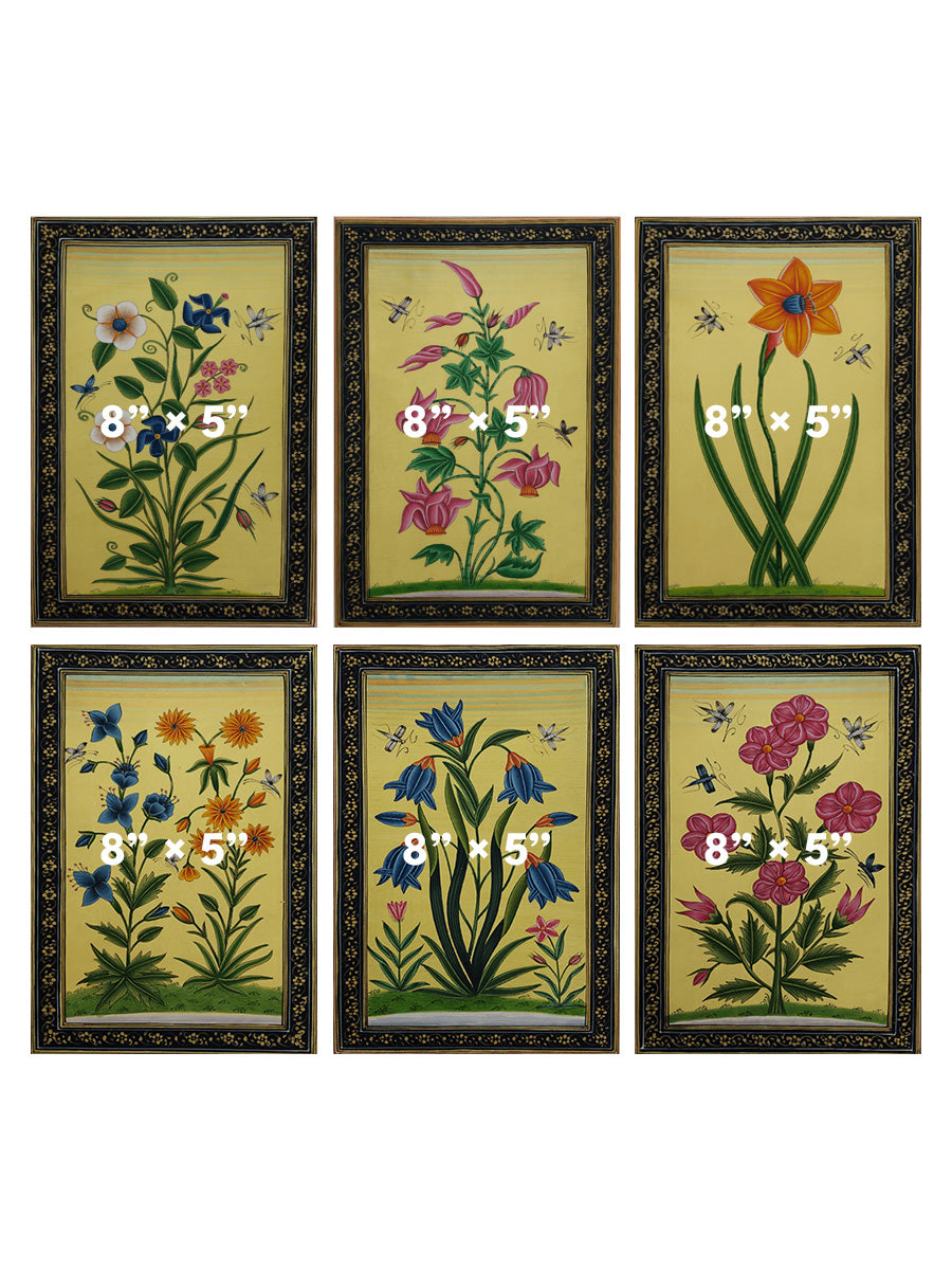 In "The Mughal Flowers," artist Mohan Prajapati masterfully weaves a vibrant tapestry of botanical beauty in the exquisite tradition of Mughal miniature painting. With delicate brushwork, he transports the viewers to an era of opulent fusion, where the rich legacies of Indian art, dating back to the 6th and 7th centuries BCE, harmoniously entwine with the Persian sophistication of the Safavid School. This botanical series is not just a painting; it's a captivating journey through time and artistry. The Mughal School of miniature painting, nurtured under the patronage of emperors like Akbar and Jahangir, became a vital means of historical documentation. The spirit of this delicate art form endures, and its traditional skills persist through generations. Rajasthan, in particular, clings steadfastly to the artistic legacy of Mughal miniature painting. Prajapati's work invites to immerse in a visual symphony of colors, patterns, and motifs that have graced the annals of art history. Each brushstroke pays homage to an artistic tradition that has transcended time, celebrating the beauty of nature and the elegance of a bygone era.
