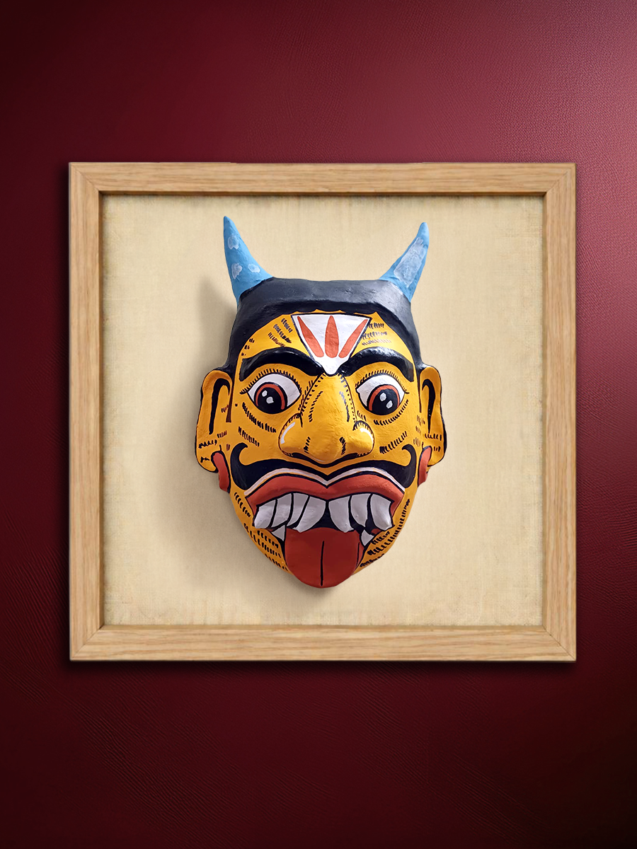This mask, with its bright yellow face, sky-blue horns, thick black moustache and extended red tongue, carries an intense yet theatrical energy. The white forehead mark and dotted facial lines add to its strong personality, giving the face a sense of age, experience and authority. The wide eyes seem alert and restless, as if the character is always in motion, always speaking, always reacting.Its wide, unflinching eyes and exaggerated features echo the kolli kannu of Drishti paintings, where seeing and being seen becomes a quiet act of protection. Like the guardian faces once painted on Tamil Nadu’s walls, this mask turns bold imagery into a watchful presence that marks space and absorbs unseen harm.