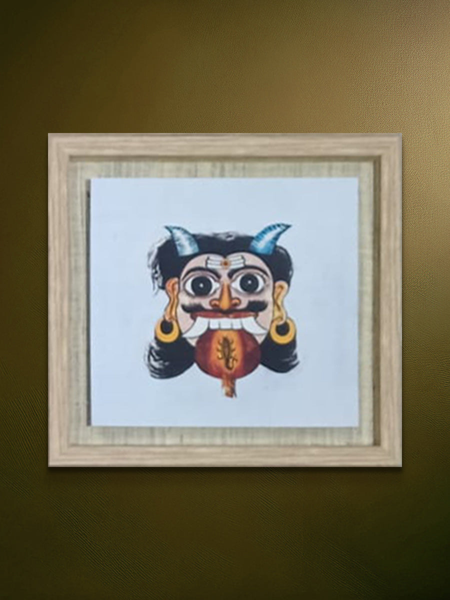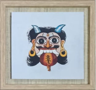 This mask stands out with its deep red face, a tall split crest rising from the forehead and piercing yellow eyes that seem constantly alert. The thick black moustache, strong nose and sharp white tusks give the character a fierce presence. A white forehead mark sits between the brows, adding a ritual note, while the small scorpion painted on the tongue hints at hidden danger beneath the loud expression. Its wide, unflinching eyes and exaggerated features echo the kolli kannu of Drishti paintings, where seeing and being seen becomes a quiet act of protection. Like the guardian faces once painted on Tamil Nadu’s walls, this mask turns bold imagery into a watchful presence that marks space and absorbs unseen harm.