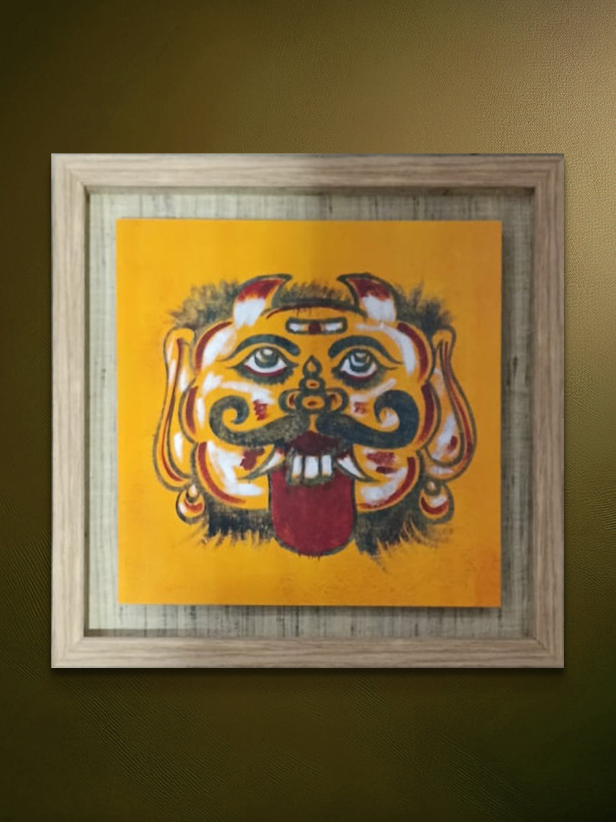 This mask stands out with its bright yellow face, sharp white tusks, small horns and wide, alert eyes. The curled moustache, red tongue and strong black outlines give it a lively, almost mischievous personality. The strokes of white and red across the cheeks add drama and movement, making the face feel animated even while still. Every line is deliberate, bold and confident, which is a hallmark of Cheriyal craft. Its wide, unflinching eyes and exaggerated features echo the kolli kannu of Drishti paintings, where seeing and being seen becomes a quiet act of protection. Like the guardian faces once painted on Tamil Nadu’s walls, this mask turns bold imagery into a watchful presence that marks space and absorbs unseen harm.