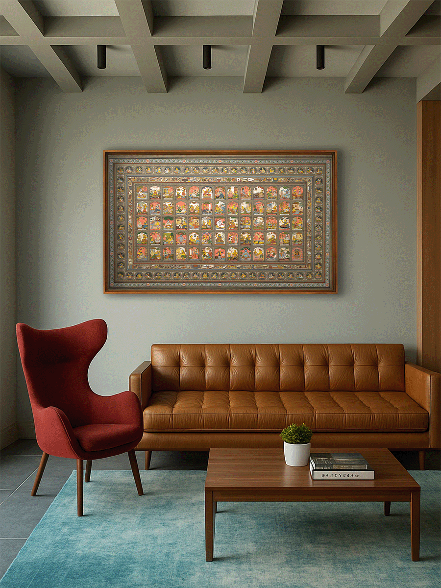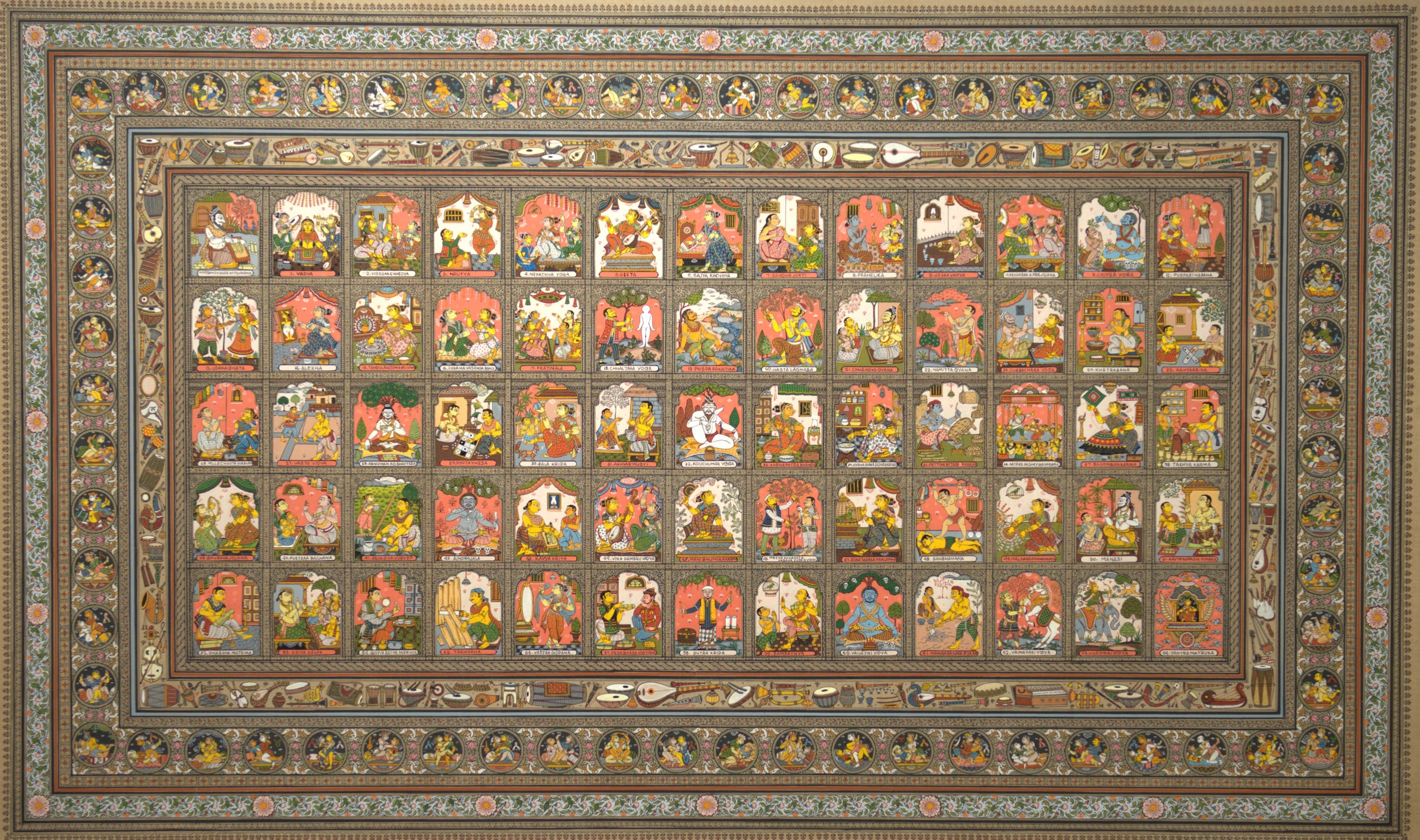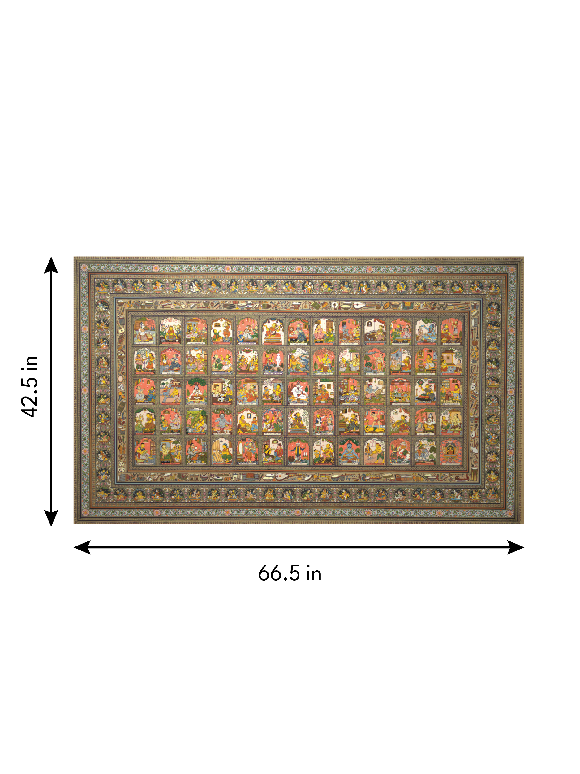 This Pattachitra painting, rooted in the 12th-century painting tradition from Odisha, vividly interprets the sixty-four arts (Badya Kama Kala) as described by Sage Vatsayana in the Kamasutra. Crafted over the span of eight months, the artwork employs natural colours that have been derived from vegetable dyes and stones, and has been painted using brushes fashioned from palm and kewra leaves. Each pictorial element seen here has been rendered in the traditional two-dimensional mode, reflecting the intricate, time-honoured techniques of Odisha’s revered scroll painting heritage.