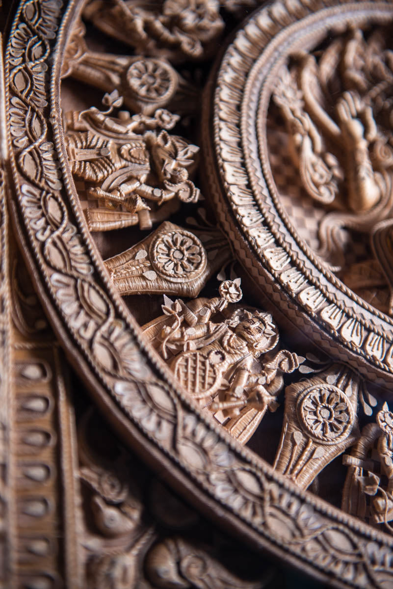 This stunning craft piece showcases the artisan's mastery of Tussar silk, a fabric derived from the larvae of silkworms belonging to the moth genus. Created using natural, uncolored Tussar silk thread, the artwork reflects Odisha’s rich heritage and intricate craftsmanship. The centerpiece features Lord Vishnu seated on Sheshanag, with his face represented as Lord Jagannatha. Surrounding this are Vishnu’s ten avatars—Matsya, Kurma, Varaha, Narasimha, Vamana, Parashurama, Rama, Krishna, Buddha, and Kalki—arranged in a circular design inspired by Odisha’s iconic Konark wheel. The artist employed meticulous techniques, wrapping Tussar silk thread around sunboard shapes to create idols, ornaments, and motifs such as parrots, elephants, and Nilachakra. Leaves and flowers were crafted using Tussar cloth pasted onto paper and cut into intricate designs. Measuring 28x28 inches, this masterpiece took one month to complete, exemplifying the delicate artistry of Tussar silk craft.