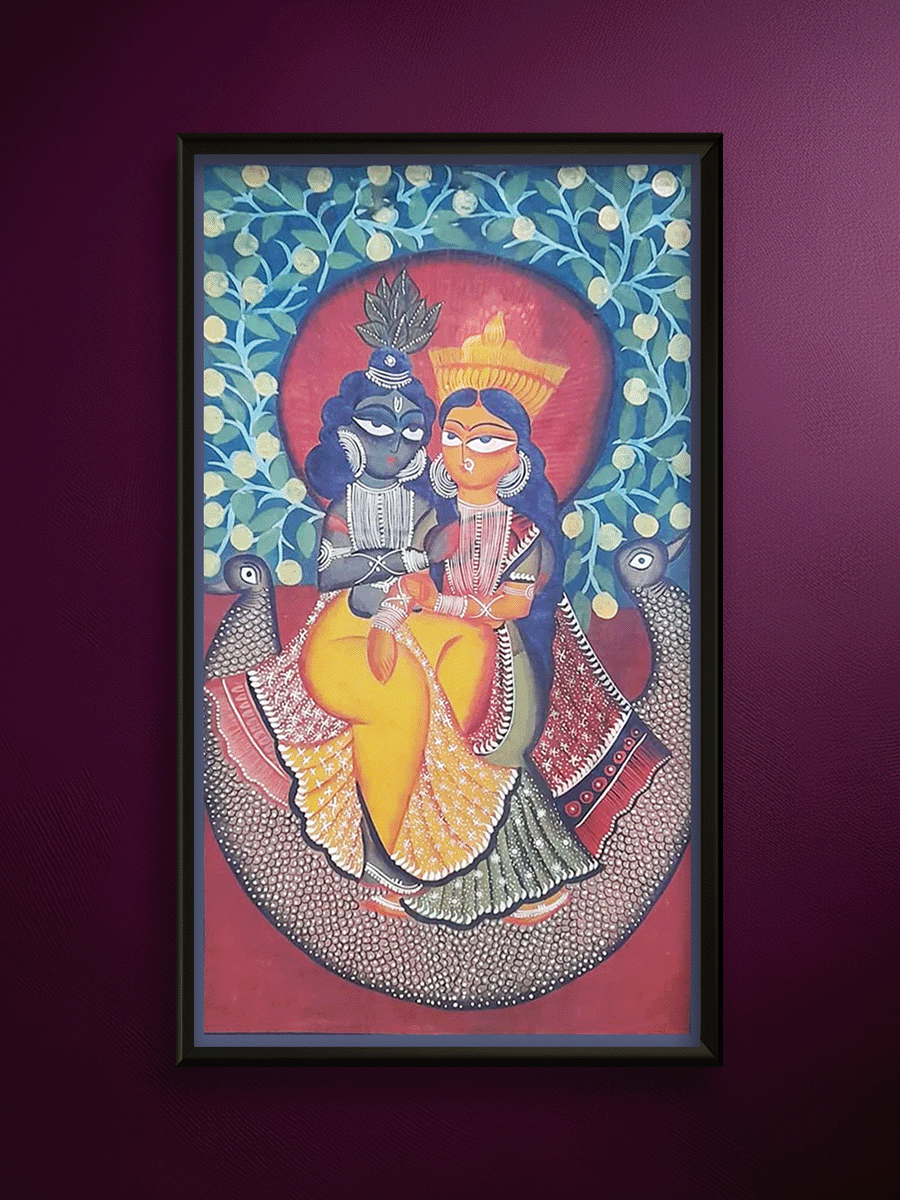 Uttam Chitrakar portrays enchanting artwork that beautifully captures the essence of their divine love as they stand alongside a magnificent peacock, a symbol of Krishna's presence. At the heart of this captivating composition, Radha and Krishna are portrayed, their divine love radiating from the canvas. Radha, adorned in resplendent traditional attire, gazes lovingly at Krishna, while Krishna, the divine flute player, reciprocates her affectionate look. Their connection is a symbol of the eternal love and devotion celebrated in Hindu tradition. By their side stands a grand peacock, its feathers on full display, mirroring Krishna's divine aura. Radha and Krishna's attire is adorned with ornate details, and their expressions convey a sense of profound affection and serenity. This Kalighat painting serves as a timeless tribute to the enduring legacy of Radha and Krishna, celebrating their eternal bond and the divine harmony they represent.