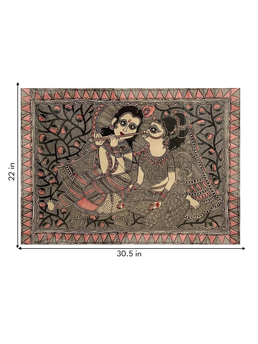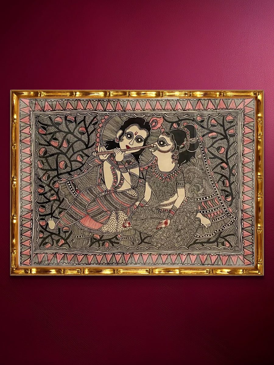 This Madhubani painting by Pratima Bharti is a masterful exploration of Shringara Rasa, the aesthetic of romantic love and spiritual devotion. Centered on the divine union of Radha and Krishna, the artwork utilizes the Katchni style’s intricate linework to create a scene that is both intimate and cosmic. The composition is anchored by the two figures seated in a close, symmetrical embrace, their large, almond shaped eyes locked in a profound gaze. This eye contact is the heart of the painting, symbolizing the non verbal communication of souls. Krishna is depicted playing his flute, the music of which is said to draw all living beings toward the divine. Radha sits opposite him, her posture and expression reflecting a state of total absorption in the melody and his presence.