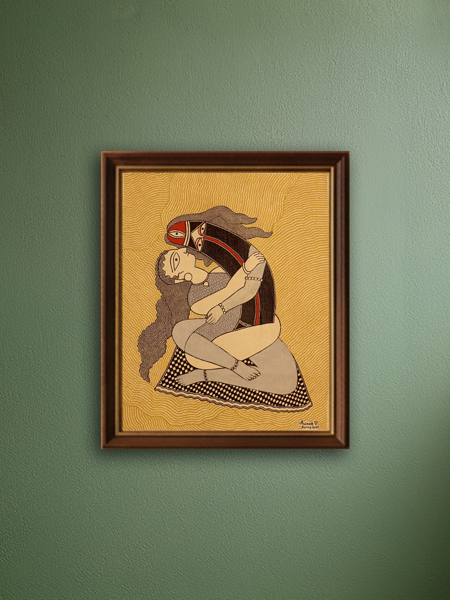 In Avinash Karn's Madhubani masterpiece, the divine union of Shiv-Shakti unfolds with striking simplicity. Predominantly bathed in deep black and vibrant red hues, the artwork pulsates with energy. Each line intricately weaves the story of cosmic harmony, where Lord Shiva, the epitome of divine masculinity, and Shakti, the embodiment of feminine power, merge in eternal unity. The line art form accentuates the intricacy of the depiction, allowing every stroke to speak volumes. As viewers gaze upon this captivating creation, they are drawn into the profound realm of spirituality and cosmic balance, where Shiv and Shakti reign supreme.