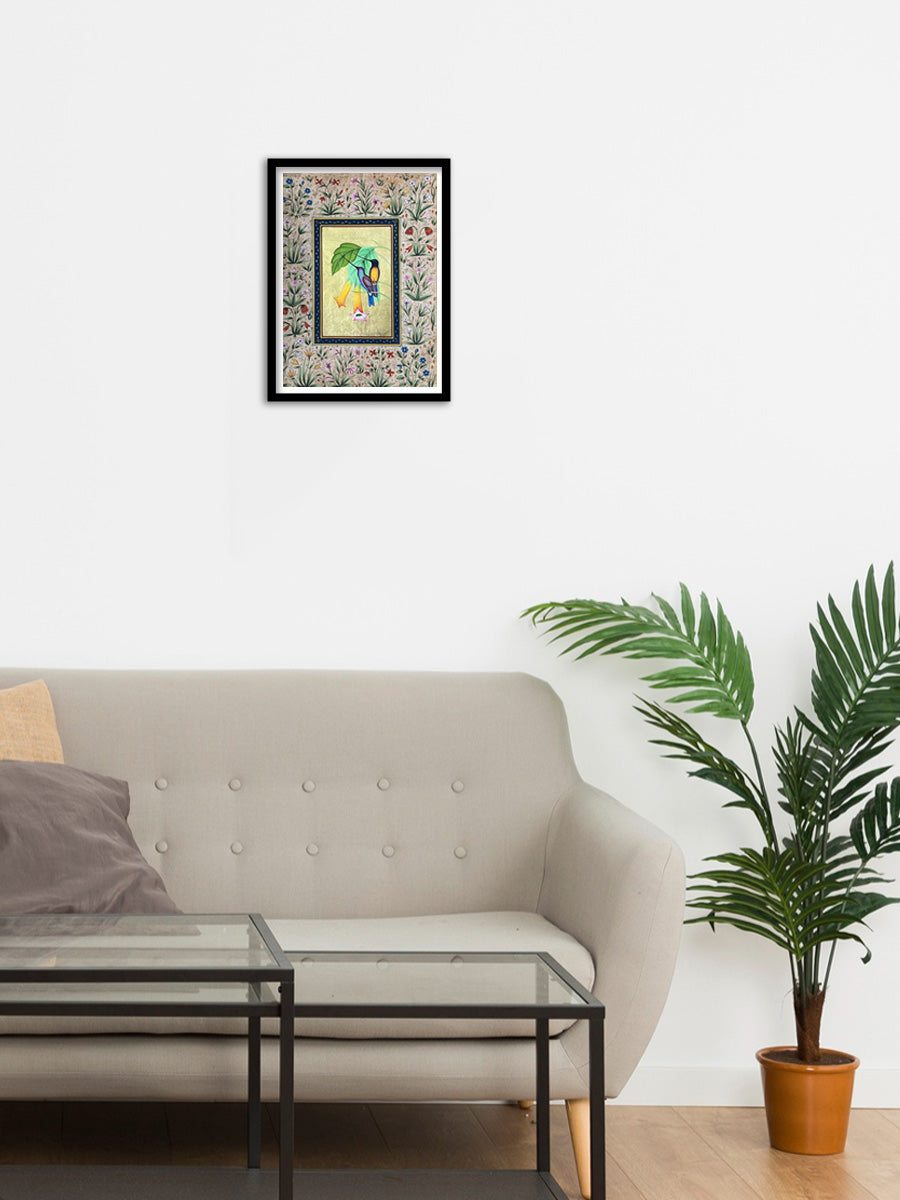 In this exquisite Mughal miniature painting by Mohan Prajapati, two birds perch gracefully on a flowering branch, their vibrant plumage contrasting beautifully with the delicate blossoms surrounding them. The scene is framed by an ornate border adorned with various types of flowers, each petal meticulously rendered to create a harmonious and intricate pattern. The birds, with their slender bodies and sharp beaks, appear almost lifelike, captured in a moment of tranquil repose. The blossoms beside them, in full bloom, add a burst of color and vitality to the composition, enhancing the overall sense of serenity and natural beauty. Prajapati’s masterful use of color and fine brushwork brings each element of the painting to life, from the soft feathers of the birds to the intricate details of the flowers. This painting is more than just an image; it is a celebration of nature’s elegance and the delicate balance found within it. The frame of diverse flowers not only enhances the central scene but also creates a sense of continuity as if the beauty of the branches and birds extends beyond the confines of the painting. The aesthetic beauty of Prajapati’s work, with its rich colors and detailed composition, invites viewers into a peaceful, enchanted world where nature reigns supreme.