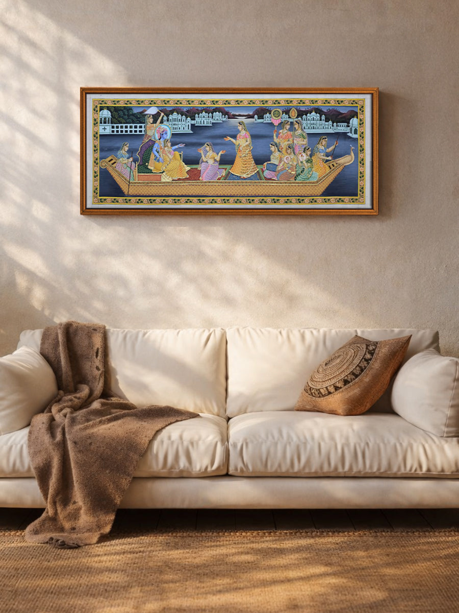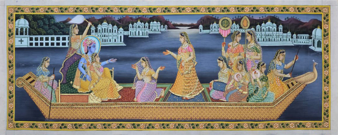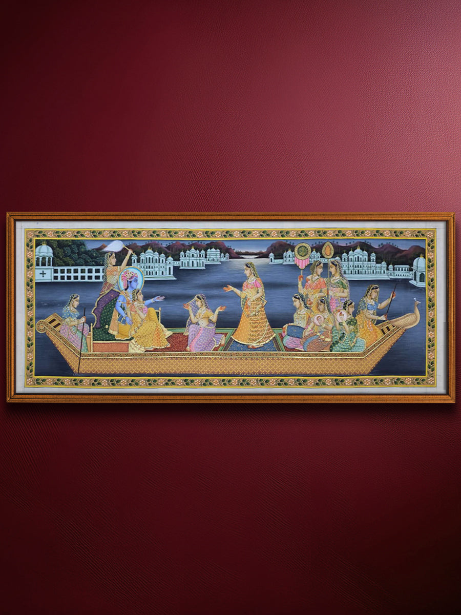 At the lower section of the boat, Krishna and Radha are shown seated together in a state of tranquil intimacy. Krishna is identified by his blue complexion and yellow pitambara, while Radha is rendered with equal grace, her presence emphasized by a gopi standing behind them wielding a fly-whisk (chauri). Above them, the boat is filled with gopis dressed in vibrant, traditional attire—detailed ghagra-cholis and translucent odhnis—who are seen playing instruments and gesturing toward the shoreline.