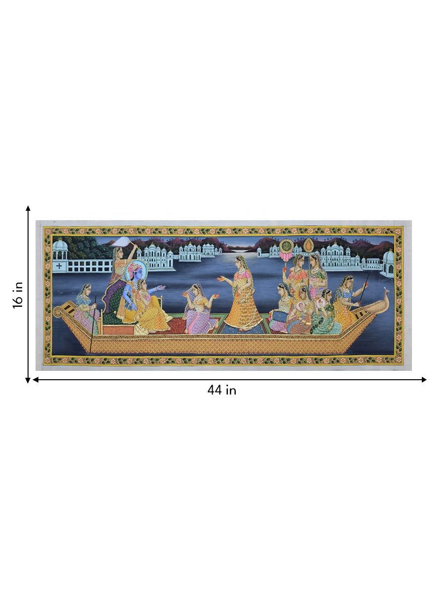 This serene yet vibrant Pichwai painting by Dinesh Soni depicts the enchanting Nauka Vihar (boat festival), featuring Krishna, Radha, and a group of Gopis navigating the sacred Yamuna River. Pichwai is a traditional art form from Nathdwara, Rajasthan, consisting of intricate paintings on cloth that originally served as devotional backdrops for the deity Shrinathji. The composition is divided into distinct tiers within the vessel, the front of which is elegantly shaped like a peacock, creating a narrative flow that moves from the divine couple's private moment to the celebratory musical atmosphere provided by their companions.