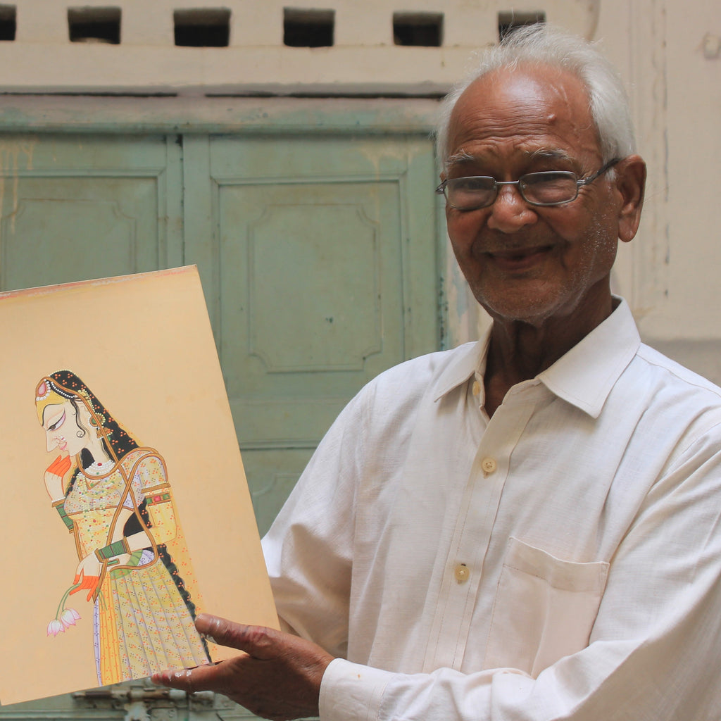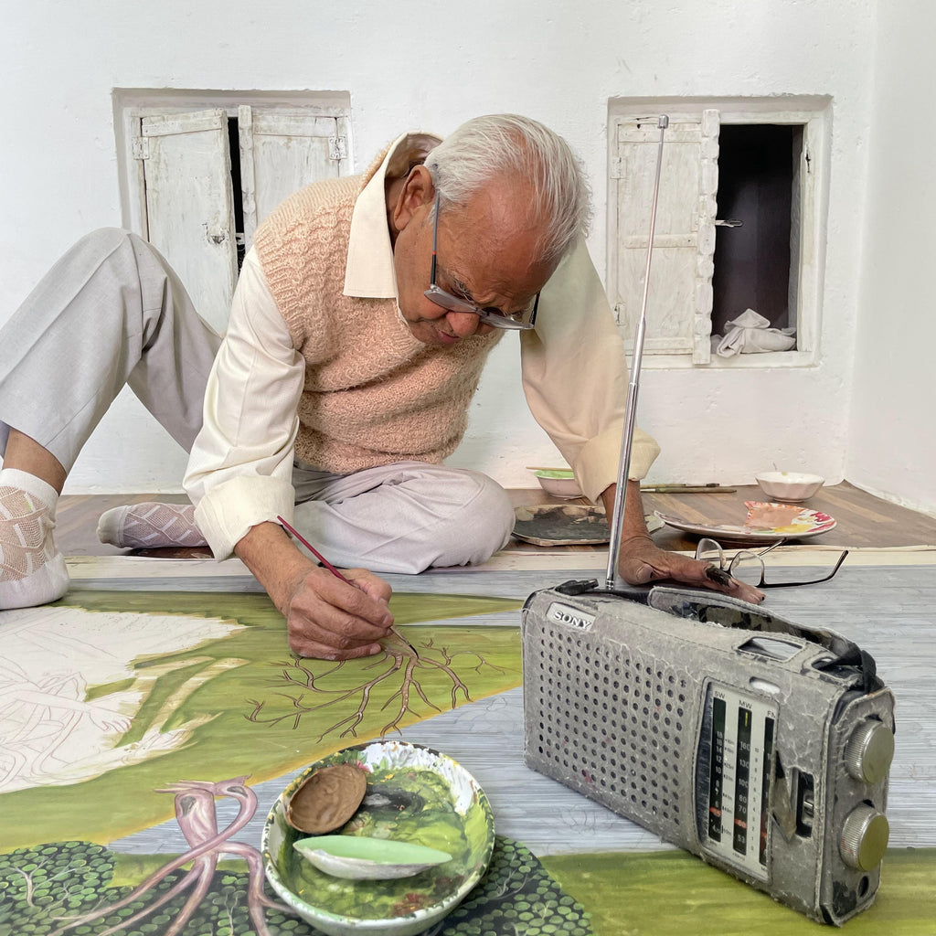 Shehzaad ji, affectionately known as 'Bhaiyyaji' (Elder Brother), is a true stalwart in the world of art. At the age of 75, his unwavering commitment to his craft is evident in his daily routine. He begins his day at 5 am and paints with dedication until 7 pm. His devotion to perfecting his art can be seen in every stroke of the paintbrush, every pot of color, and every exquisite painting he creates.