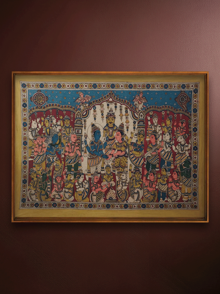 Renowned artist Siva Reddy's "Srinivasa Kalyanam" is a mesmerizing piece of Kalamkari painting that transports the viewers to a world of vivid imagery and colors. This artwork embodies the essence of this ancient Indian artform, where every hue, shade, and stroke harmoniously dances together. Kalamkari, a traditional art form, narrates stories from Hindu mythology, and "Srinivasa Kalyanam" is no exception. It vividly depicts the divine wedding of Lord Vishnu (Srinivasa) and Goddess Lakshmi, a celestial celebration captured in rich, ethereal, and radiant hues. The artist's skillful use of intricate patterns and motifs weaves a tale of love and devotion, drawing the viewer into a realm of timeless beauty. With its perfect coordination of shades and a profound understanding of color theory, this painting stands as a testament to Reddy's mastery in Kalamkari. This artwork is a mesmerizing testament to an art form that tells stories through colors, patterns, and a rich cultural heritage.