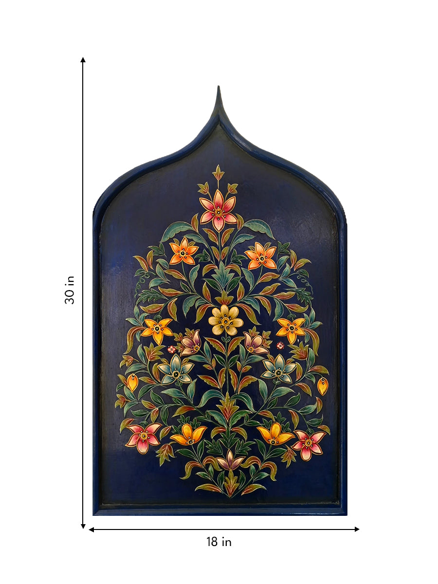 This Usta Miniature painting by artist Pankaj Kumar is a refined example of the Bikaner school, featuring a symmetrical and highly decorative floral composition. The artwork is presented within a deep, navy blue arched frame, which mimics the architectural "Mihrab" and windows common in Rajasthani palace design. Centered against a rich, velvety midnight blue background, the painting depicts a flourishing tree or shrub with a variety of colorful blossoms that taper toward the top of the arch.