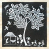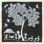 In this rural scenery, Dilip Bahotha depicts a traditional view of a Warli Village. The painting depicts a huge Tree that holds tremendous significance as a resource and a spiritual emblem. Surrounding the Tree, human figures engaged in the rhythm of their daily lives, with a mother tending to her child, a mother tending to her child, men farming, women carrying pots of water on their heads, etc. The sky is filled with birds flying suggesting the joyous spirit of community gatherings. The inclusion of birds, along with other elements of nature, contributes to the overall visual narrative and balance. This scenery serves as a testament to the interdependence and harmony within the ecosystem.