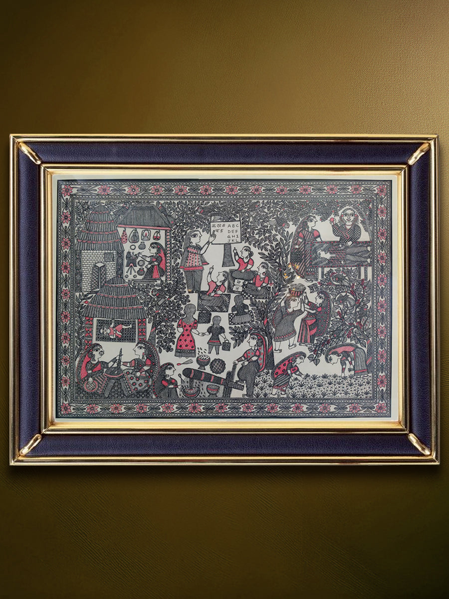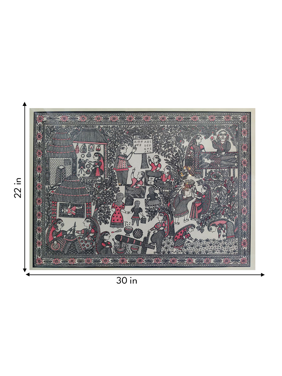 This detailed Madhubani narrative by Ambika Devi is a masterful exploration of women as the primary architects of community growth, education, and social welfare. Set against a neutral, sun-bleached background, the artist employs a sophisticated, limited palette of charcoal black, slate grey, and madder red. Using the intricate Kachni (line work) style, the composition is organized into a series of meaningful vignettes that celebrate the multitasking brilliance of women in a rural yet progressive setting.