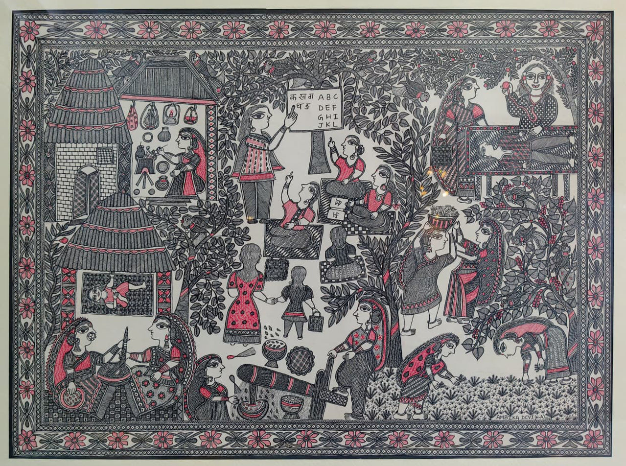 Throughout the piece, the traditional and the progressive coexist harmoniously. Lush, bird-filled trees weave through the scenes, reflecting the deep environmental connection inherent in the Mithila tradition. The entire work is enclosed within a sophisticated triple border featuring geometric and floral patterns, anchoring a vision where women are not just participants, but the essential pillars holding together the fabric of society. Through this work, Ambika Devi honors the tireless efficiency and multi-faceted grace of women who lead their communities into a brighter future.