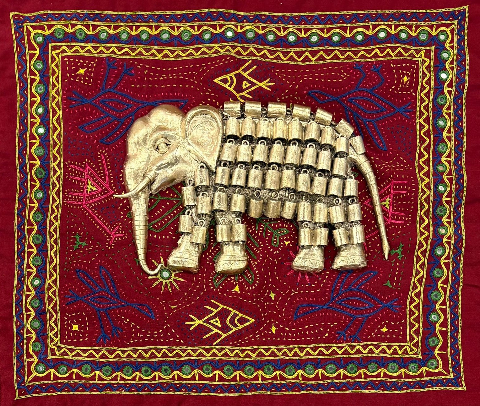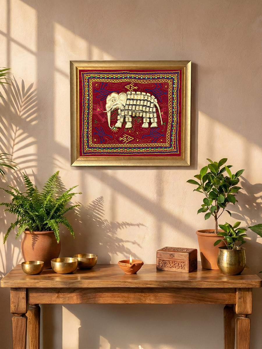 This mixed-media craft combines a Dokra-cast elephant composed of lock-shaped metal units with a richly embroidered Kutch appliqué textile backdrop. The elephant’s body is constructed from multiple small Dokra locks, linked together to form a segmented, articulated figure. Cast using the traditional lost-wax technique, these lock forms introduce layered meanings of protection, security, and continuity, while also lending the animal a rhythmic, modular structure.