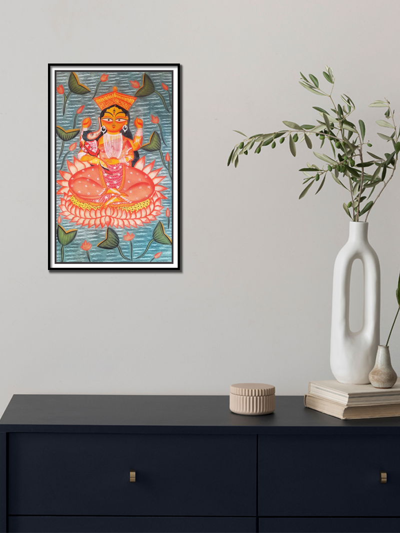 Uttam Chitrakar portrays a captivating tableau that encapsulates the eternal bond between a mother and her son, as well as the richness of Hindu mythology.At the heart of the painting, Goddess Parvati is portrayed, the divine consort of Lord Shiva, and the embodiment of grace, beauty, and maternal love. She is depicted in all her celestial glory, her serene countenance radiating compassion. In her arms, she cradles her beloved son, Lord Ganesha, the elephant-headed god of wisdom and auspicious beginnings. Ganesha gazes at his mother with a mixture of affection and innocence, embodying the purity of a child's love.Uttam Chitrakar's artistic prowess is evident in the intricate details that adorn this masterpiece. The vibrant colors breathe life into the divine figures, and every brushstroke seems to convey a story of its own.It serves as a reminder of the profound and enduring values that this ancient art form continues to convey to generations.