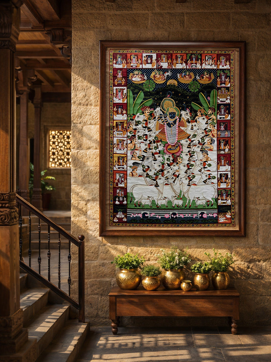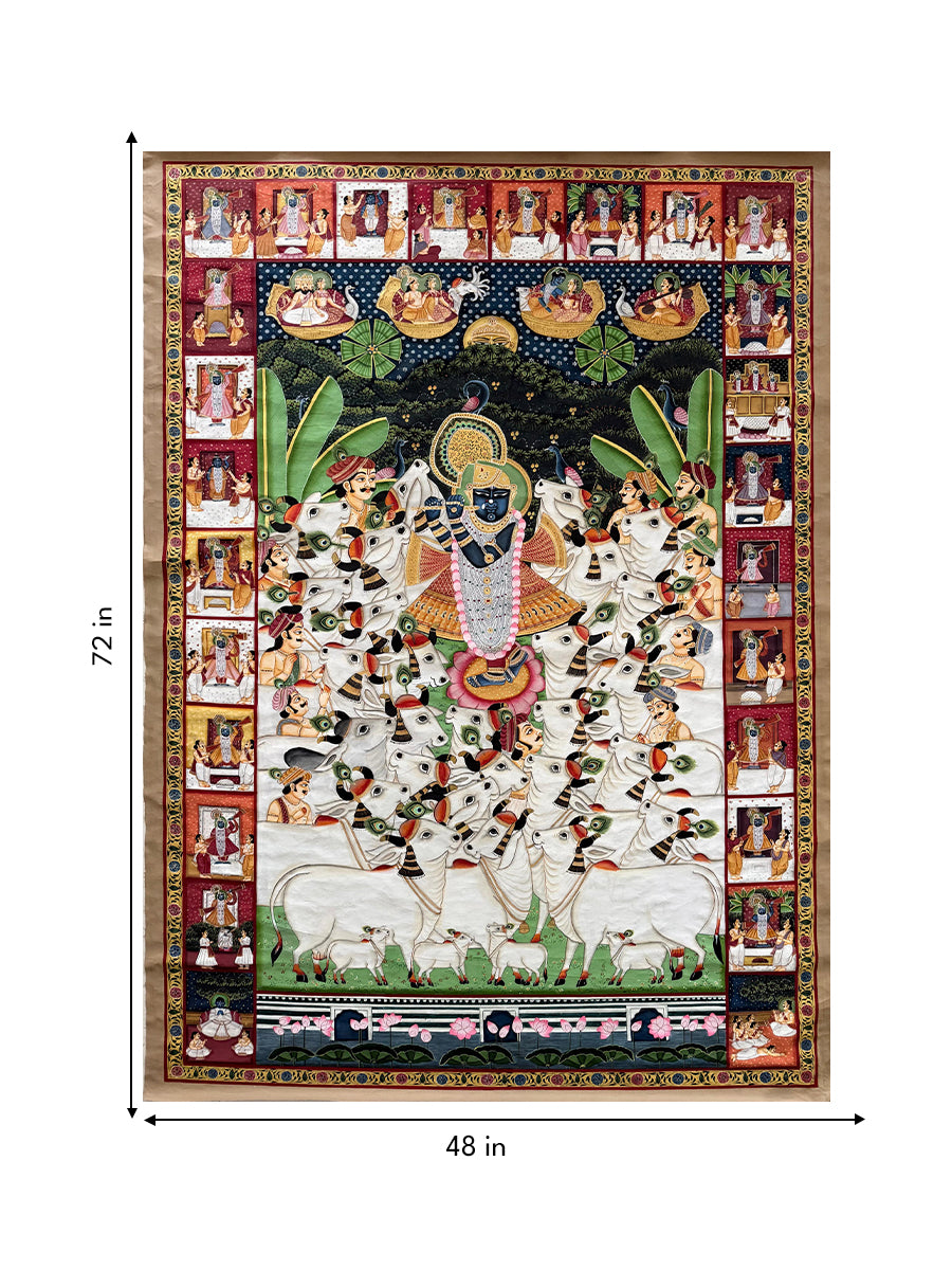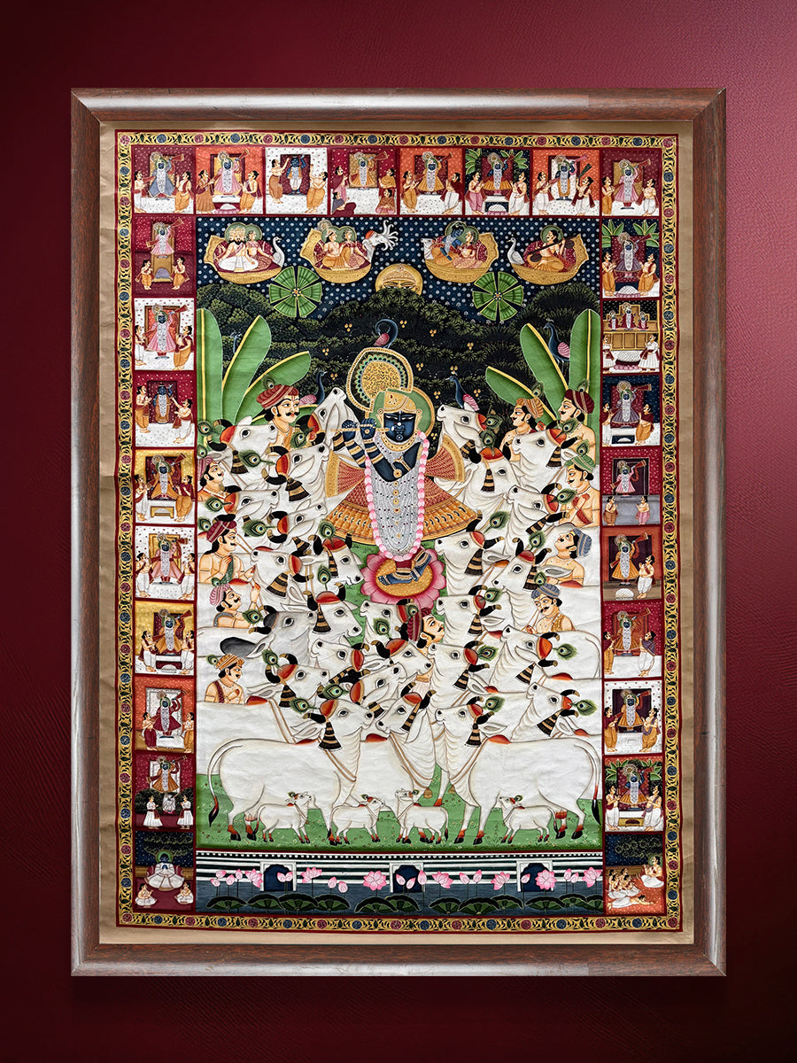 Along the borders, a sequence of small panels portrays twenty-four darshans (manifestations) of Shrinathji, illustrating different ritual adornments and devotional forms worshipped in the Nathdwara tradition. Additional scenes depict Goswami's instructing disciples and motifs such as the Kamal Talai (lotus pond), situating the image within the devotionnal world of the Vallabha Sampradaya. Together, the composition presents Shrinathji as the cosmic centre of devotion, revered by humans, animals and gods alike.