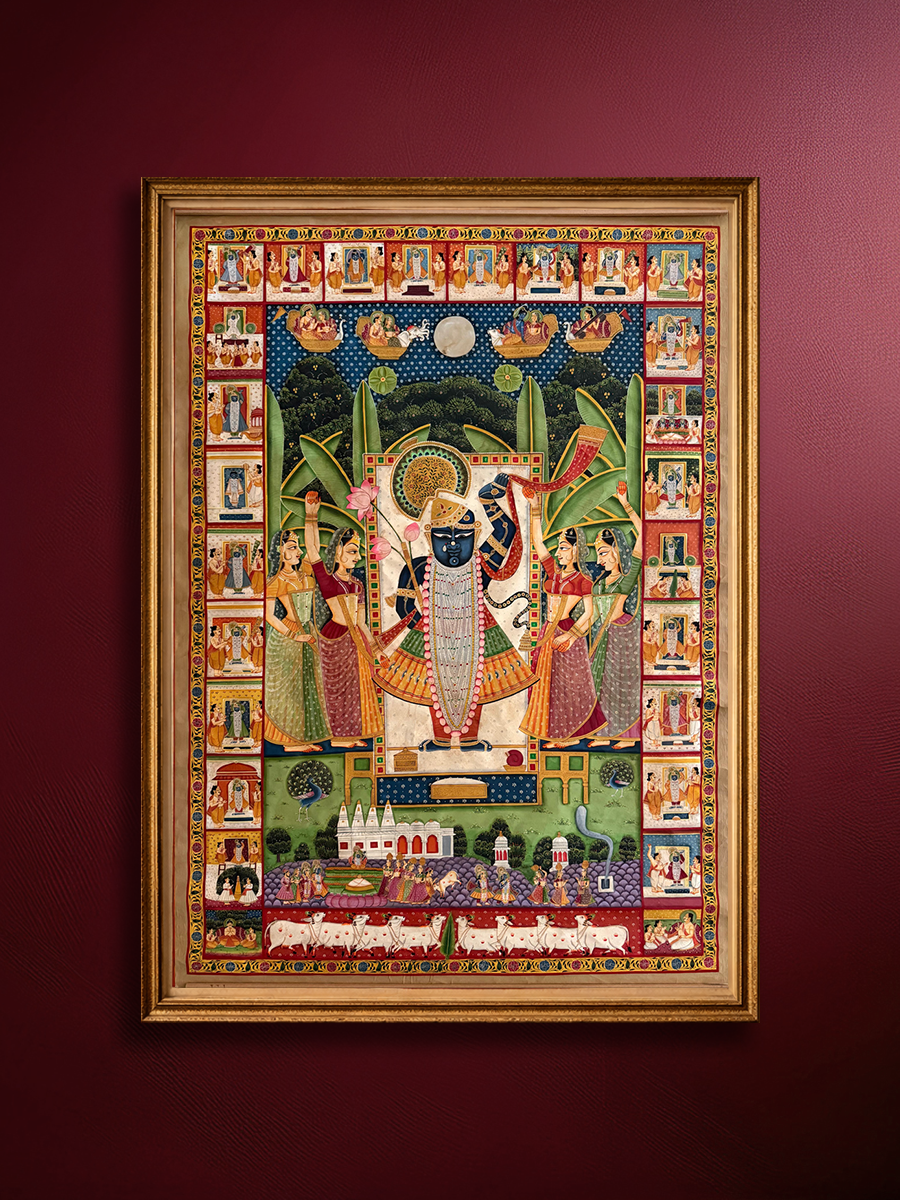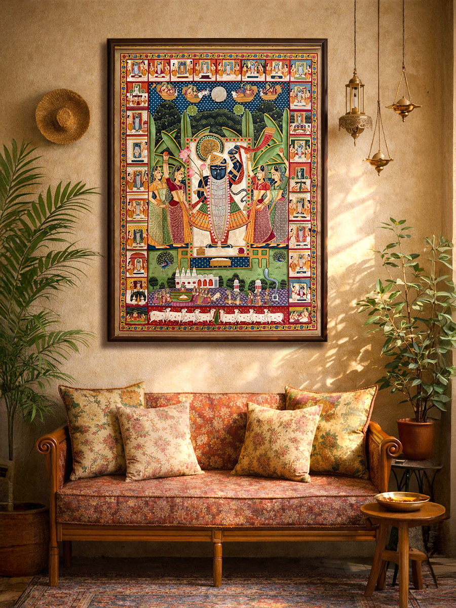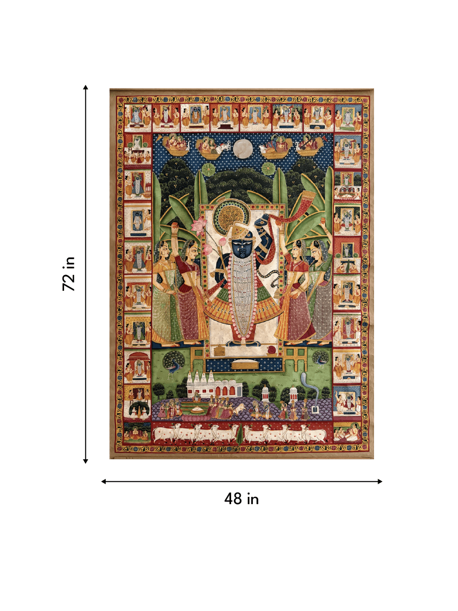 The painting reflects the traditional aesthetics of Nathdwara Pichwai art, characterized by intricate ornamentation, vivid pigments, and devotional storytelling. Through its layered composition and meticulous craftsmanship, the work becomes not merely a painting, but a sacred object meant to inspire contemplation, devotion, and celebration of Krishna’s divine presence."