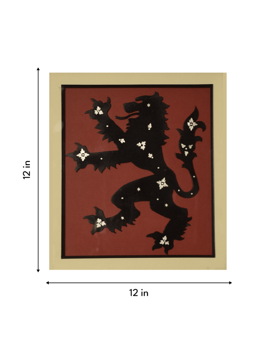 In this striking Koftgiri artwork, artist Shyamlata Gahlot presents a powerful heraldic lion rendered in bold silhouette. Koftgiri is a traditional metal inlay technique in which fine silver or gold is embedded into a darker metal surface, creating contrast through precision rather than colour. Set against a deep red ground, the blackened form of the lion dominates the composition with strength and clarity.