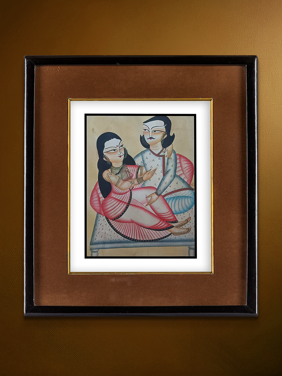The scene conveys intimacy and companionship in everyday domestic life, reflecting the Kalighat tradition’s interest in contemporary urban couples and human relationships rendered with warmth and immediacy.