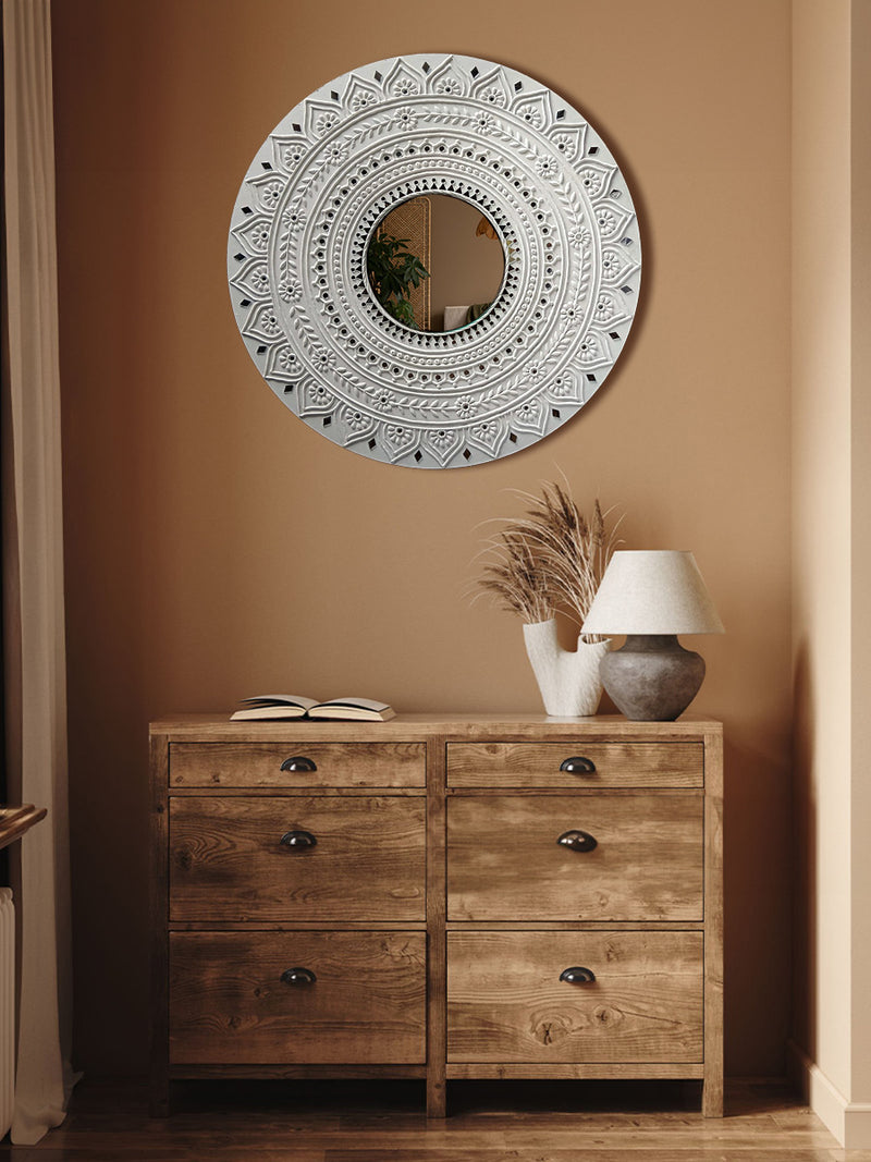 Renowned mudwork artist Nalemitha in his artwork impressively showcases a circular mirror in the middle of an intricate mandala pattern with floral leaves carrying multiple layers of significance, ranging from spiritual and cultural symbolism to aesthetic and decorative elements. The mirror serves as a focal point in the design, drawing the viewer's eye and encouraging contemplation and introspection. The combination of a circular mirror and intricate mandala patterns with floral leaves creates a visually stunning and harmonious design. Such a piece of art can be used as a decorative element in interior design. The mirror reflects light and space, making the room feel brighter and more spacious. The intricate mudwork and floral leaves can add texture and depth to the design.