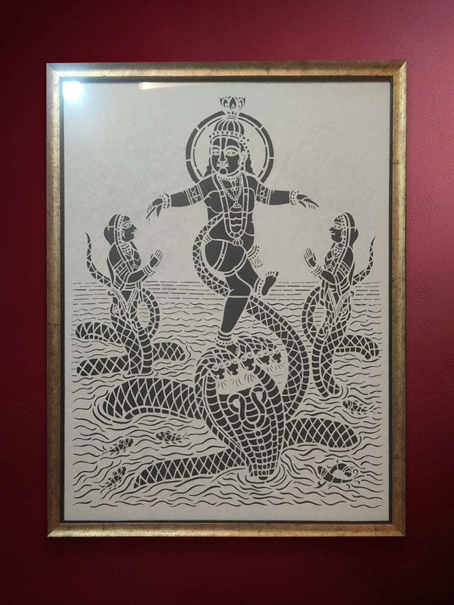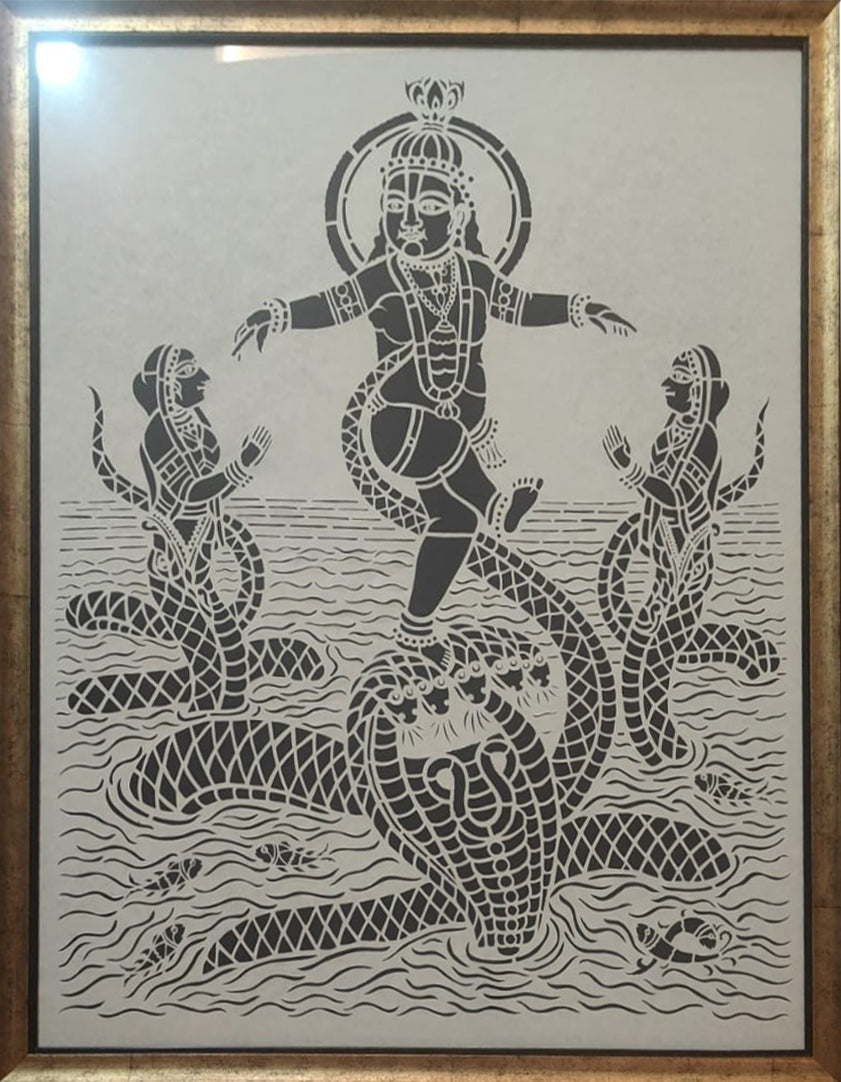 In the center of the piece, the young Lord Krishna is shown dancing triumphantly upon the multi-headed hood of the serpent Kaliya, his arms outstretched and a divine halo framing his head. On either side of the central figure, the Naginis—the wives of the serpent—emerge from the water with human torsos and coiled serpentine tails, their hands joined in prayer as they plead for mercy. The bodies of the serpents are adorned with a meticulously cut diamond-lattice pattern that adds a sense of texture and movement to their forms. The entire scene is set against the stylized waters of the Yamuna, represented by rhythmic wavy lines that fill the lower half of the frame. Tiny fish are scattered within the ripples, providing a sense of scale and life to the river setting. This piece serves as a remarkable testament to the technical skill of Ashutosh Verma, capturing a dynamic moment of divine victory through the fragile and demanding medium of hand-cut paper.