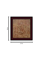 This mesmerizing terracotta artwork by Dolon Kundu vividly captures the legendary episode of Lord Krishna subduing the venomous serpent Kaliya with extraordinary intricacy and devotion. Set within a deep wooden frame with a rich red background, the relief showcases Krishna’s divine grace as he dances effortlessly upon the multiple hoods of the serpent in the turbulent waters of the Yamuna. His poised stance, adorned with traditional ornaments and an elaborate crown, radiates celestial energy as he crushes the ego of the fearsome Kaliya, whose sinuous form coils beneath him in submission. The rippling water, beautifully textured with swirling patterns and floating lotus leaves, enhances the dynamic movement of the scene, while the detailing of Krishna’s flowing garments and serene expression captures his divine playfulness amidst the chaos. On either side, Kaliya’s wives stand in reverence, offering prayers and pleading for their husband’s mercy, their intricately carved attire and ornaments reflecting the artist’s meticulous craftsmanship. The upper section of the relief portrays the tranquil banks of the Yamuna, with lush trees, village huts, and anxious onlookers witnessing this celestial event with folded hands. The harmony between nature, divinity, and mythology in this piece showcases Dolon Kundu’s ability to translate spiritual narratives into tangible, breathtaking art. The earthy warmth of terracotta enhances the sacred essence of the moment, making this masterpiece not just a visual delight but a profound tribute to Krishna’s divine power and compassion.