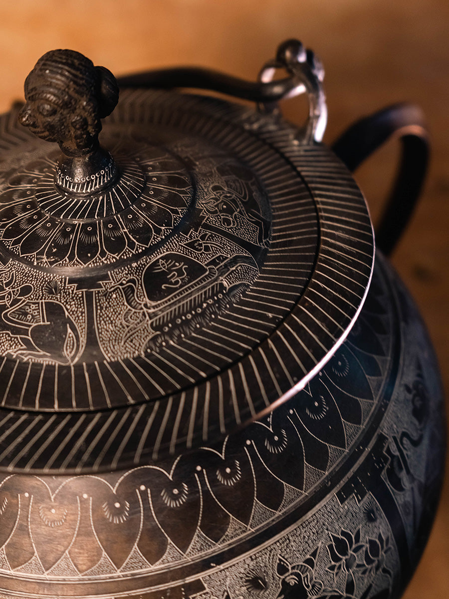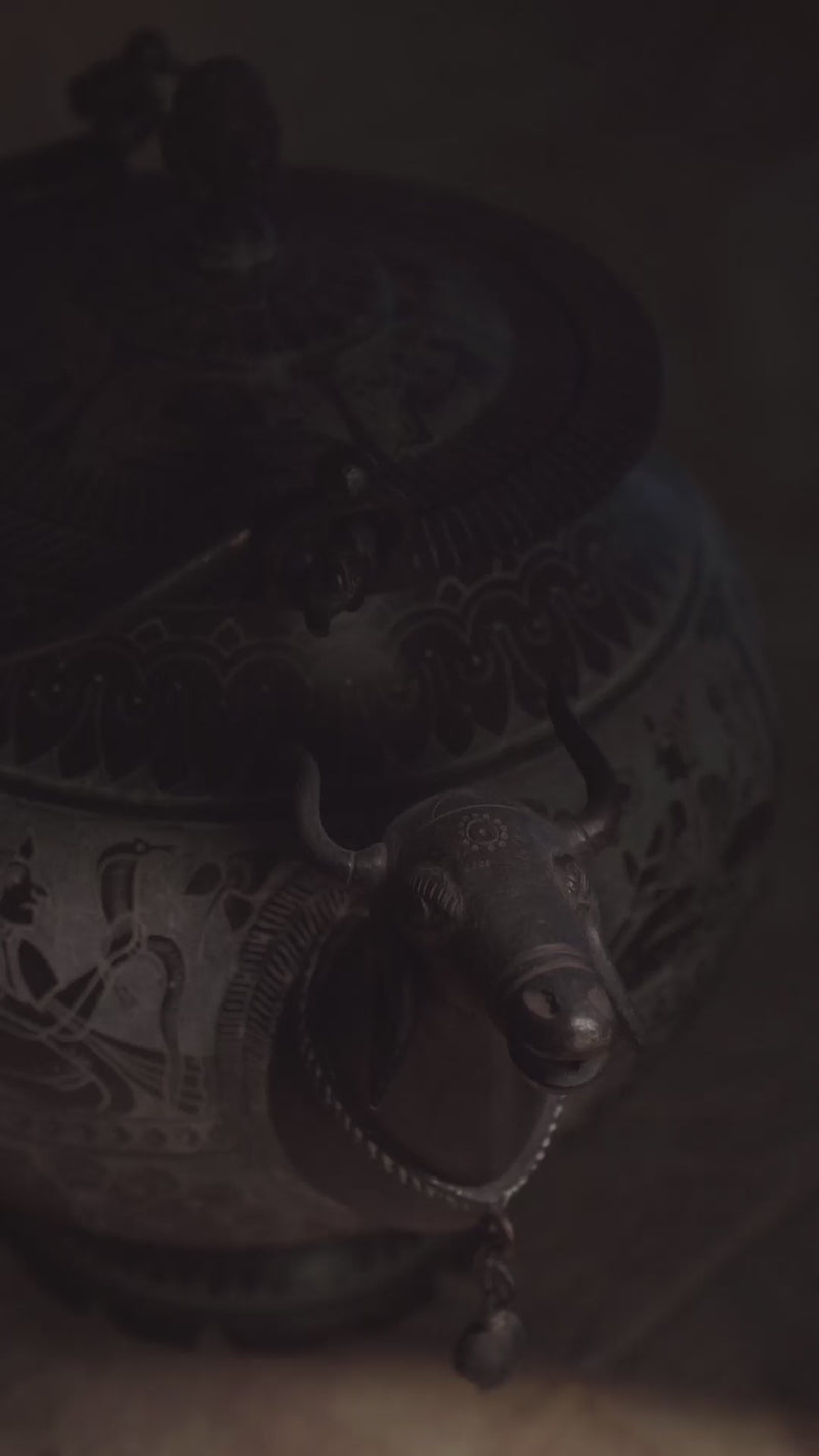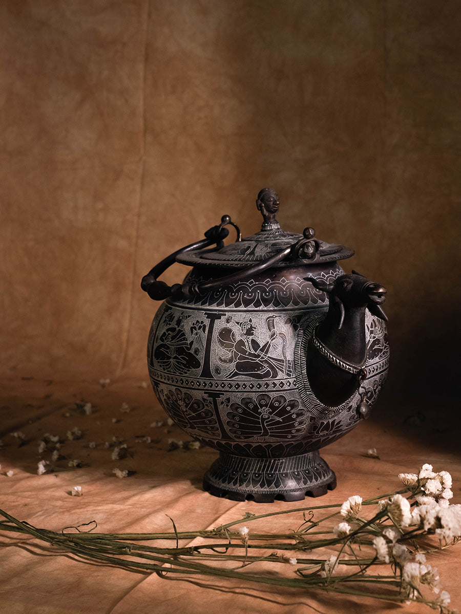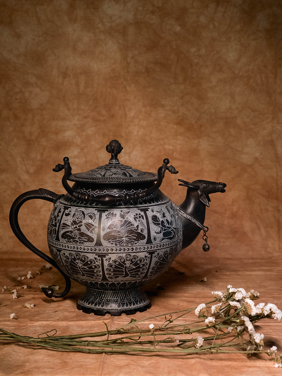 Crafted by Ms. Shakuntala Soni, a skilled metal artisan from Khajuraho, this Mrigh Mukh Kamandal is a testament to her mastery over traditional metal casting and finishing techniques. With over 25 years of experience, the artist has evolved new designs while preserving ancient craftsmanship. The kamandal, a vessel traditionally used to offer water and milk to deities, features intricate carvings of Ganesh, Lakshmi, Vishnu, Garuda, Radha, Krishna, and other mythological figures. The creation of such metalware involves meticulous sketching, followed by chiseling and engraving with precision tools. This piece, crafted in a span of 45 days, has been recognised with a state-level incentive award by the Madhya Pradesh Handicraft and Handloom Development Corporation, and showcases the artisan’s ability to blend traditional techniques with innovative designs.